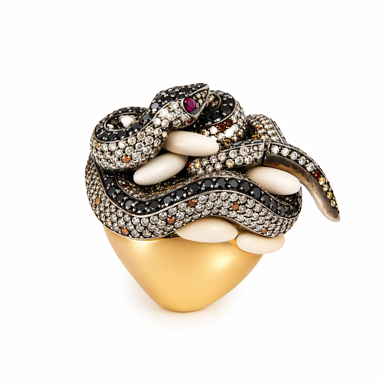 Yüzeyi kaplayan pırlantalar, tasarıma yoğun ve sofistike bir ışıltı kazandırırken; yılanın kıvrımları arasında yer alan yumurta formundaki detaylar bu hikâyeyi tamamlar. Göz kısmında kullanılan kırmızı taş ise tasarıma güçlü ve dikkat çekici bir vurgu ekler.