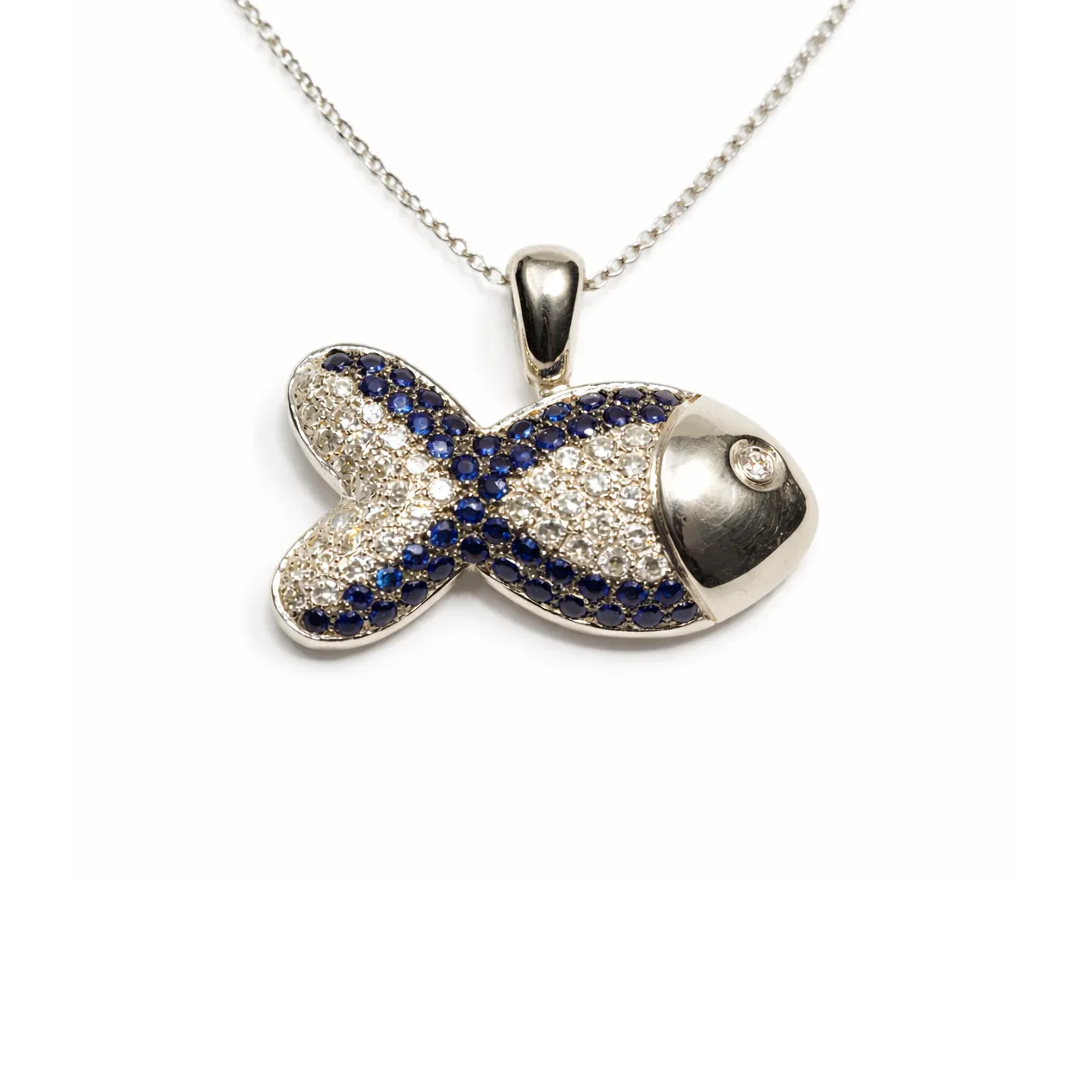 Balık formunda tasarlanan bu kolye, mavi safir ve pırlanta taşların birlikte kullanımıyla dikkat çekici bir görünüm sunar. Gövde boyunca yer alan taş dizilimi, tasarıma hareket ve ışık kazandırırken parlak metal yüzeyle dengelenir. Günlük kombinlere farklı bir karakter katarken, özel anlarda da öne çıkan bir parça olarak tercih edilebilir.