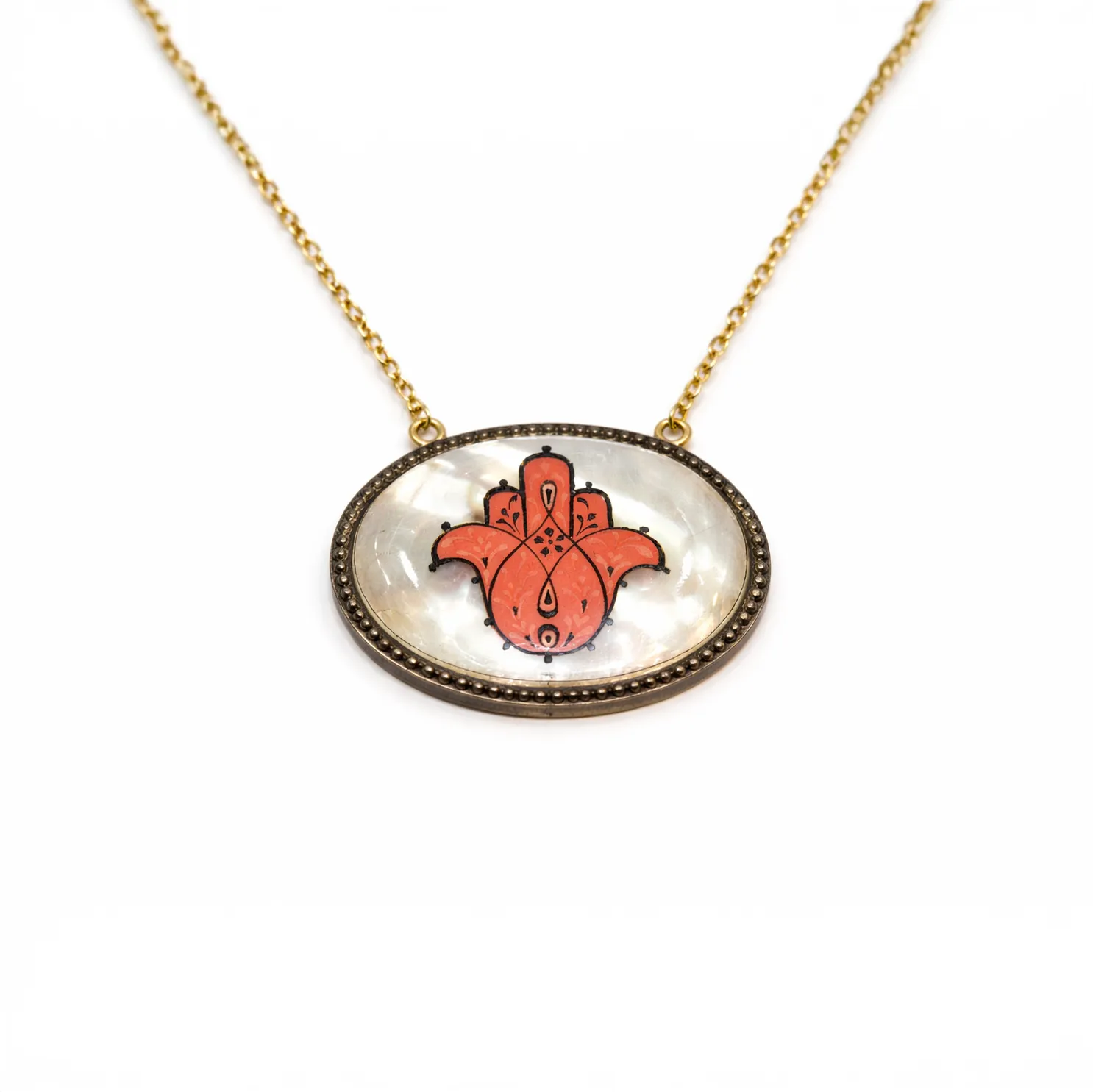 Doğal sedef zemin üzerine işlenen Fatima Ana Eli motifi, bu kolyeye hem anlam hem de zarif bir estetik kazandırır. Canlı mercan tonlarındaki desen, sedefin yumuşak ışıltısıyla kontrast oluşturarak dikkat çekici bir görünüm sunar. Okside detaylı çerçeve, tasarıma vintage bir karakter katarken, sembolik anlamı ile koruyucu ve şans getirdiğine inanılan özel bir parça olarak öne çıkar.