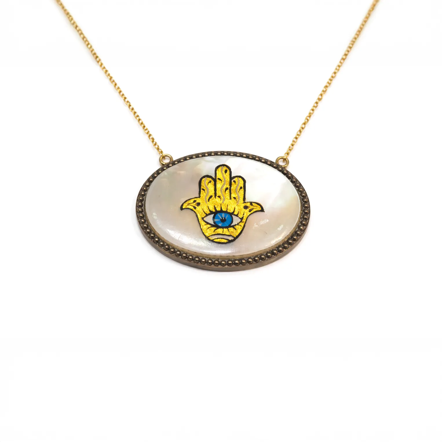 Doğal sedefin zarif ışıltısı üzerine işlenen altın tonlu Fatma Ana Eli ve nazar gözü motifi, bu kolyeye hem estetik hem de anlam yüklü bir karakter kazandırır. Oval formdaki tasarım, klasik sembolleri modern bir yorumla sunarken; merkezdeki mavi göz detayı güçlü bir koruyucu ifade yaratır.