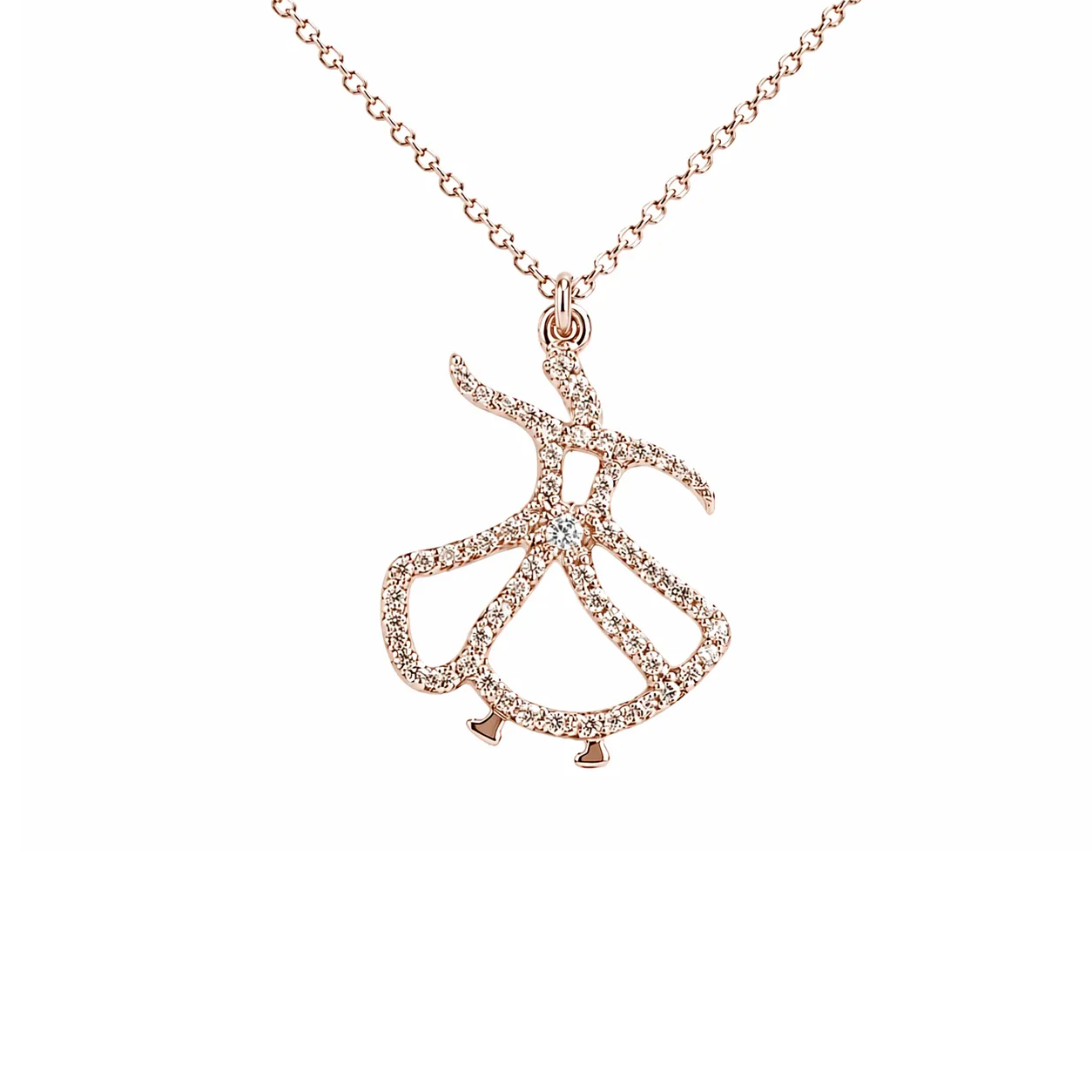 Semazen figüründen ilham alan bu özel tasarım kolye, estetik ve anlamı bir araya getirir. Akışkan hatlarla şekillenen figür, pırlantaların zarif ışıltısıyla bütünleşerek dikkat çekici ve sanatsal bir görünüm sunar.