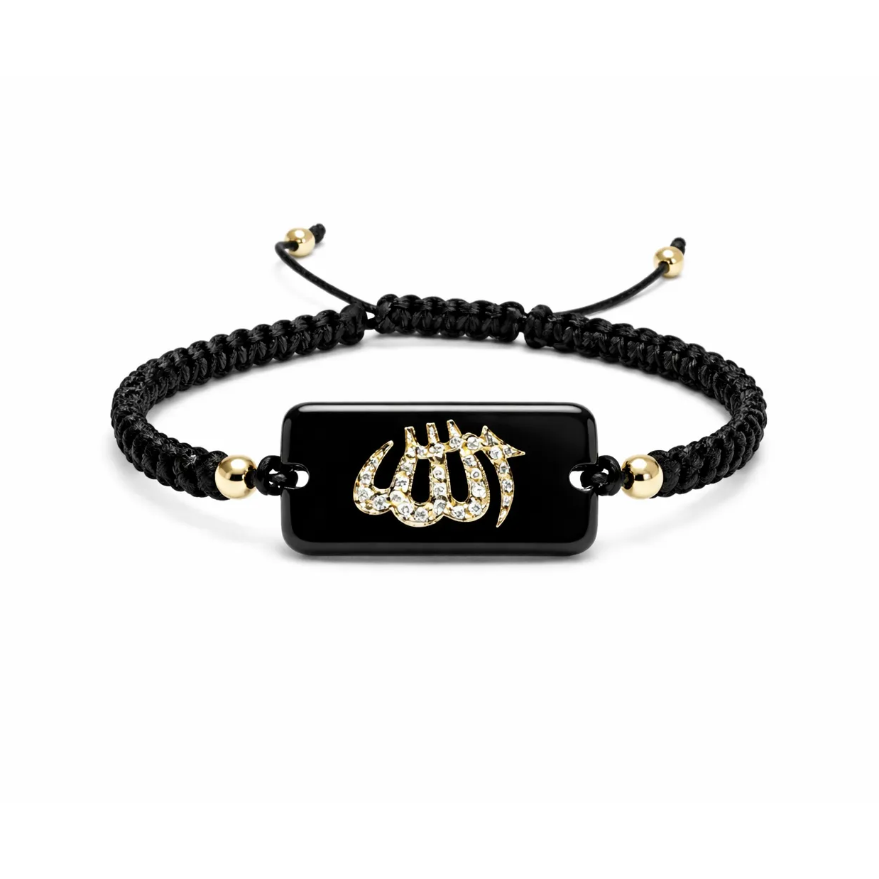 Siyah örgü ip tasarımı ve altın üzerine işlenmiş pırlanta detaylı Allah yazısıyla öne çıkan bu bileklik, güçlü ve anlamlı bir duruş sunar. Parlak yüzey ve taşların ışıltısı, tasarıma dikkat çekici bir vurgu kazandırır.
