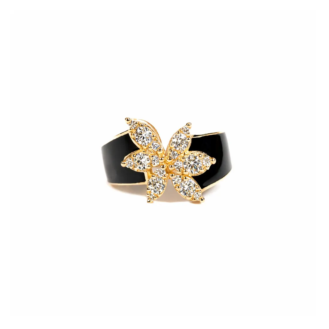 Siyah mine detaylı altın yüzük üzerinde pırlanta çiçek tasarımı. Modern ve şık görünümüyle dikkat çeken özel tasarım yüzük.