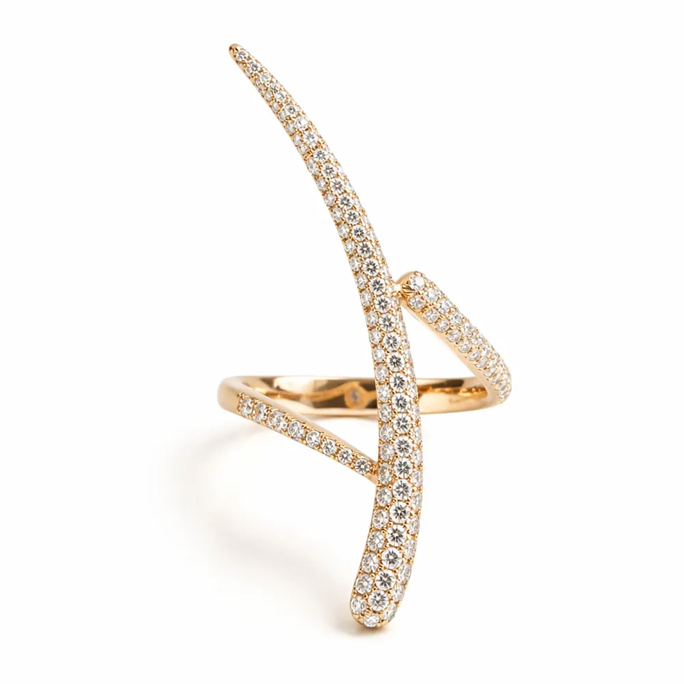Çapraz ve yükselen formlar, yüzük üzerinde dengeli bir hareket hissi yaratırken; yüzey boyunca yer alan pırlanta detaylar tasarıma zarif bir ışıltı kazandırır. İnce işçilikle oluşturulan bu heykelsi form, modern ve güçlü bir stilin ifadesidir.