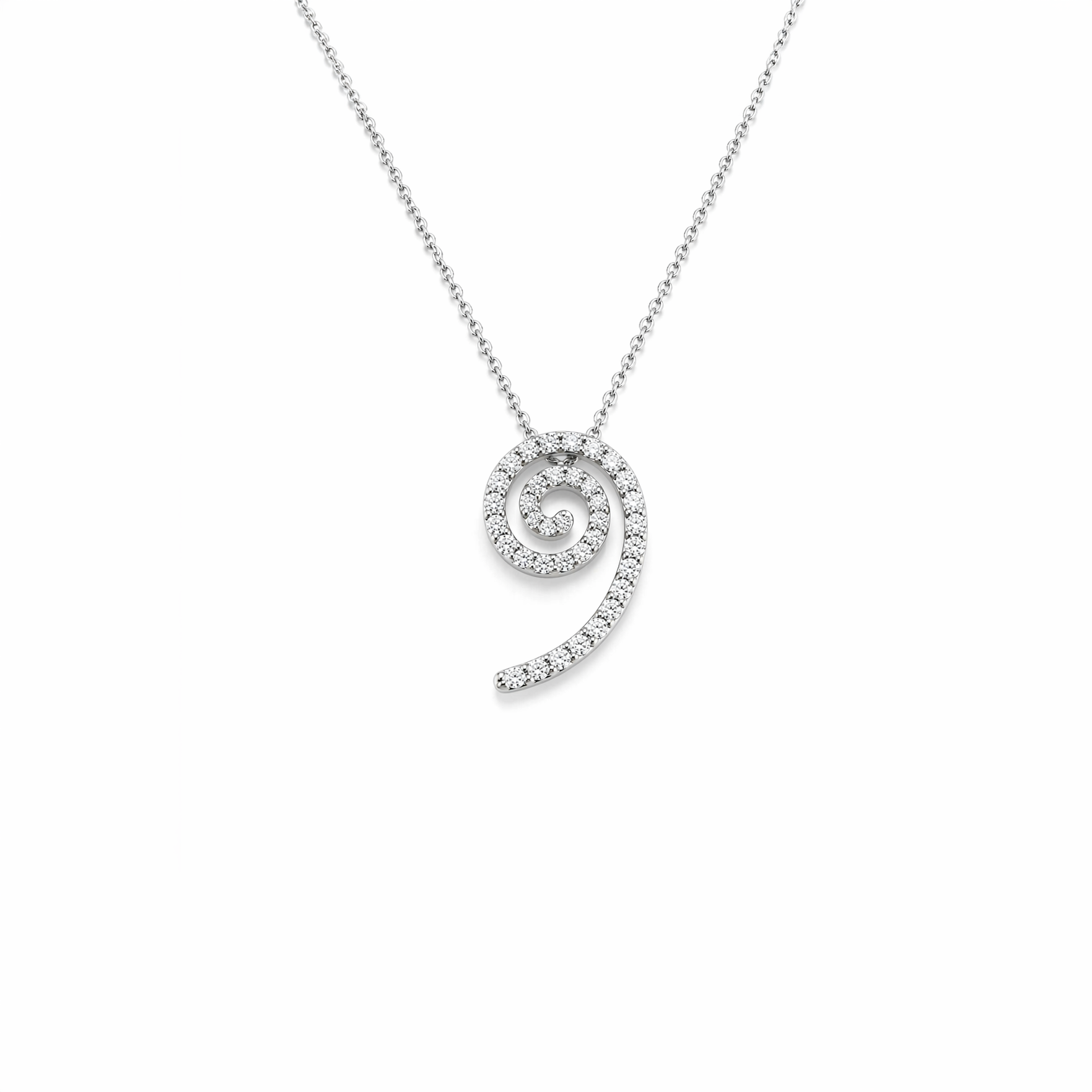 Akıcı spiral formu ile dikkat çeken bu kolye, hareket hissi veren tasarımıyla farklı bir stil sunar. Formun kıvrımlı yapısı, ışığı farklı açılardan yakalayarak pırlanta detayların daha canlı görünmesini sağlar.