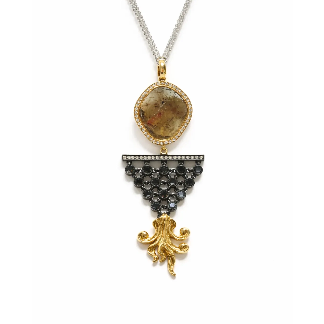 Turmalin taşın doğal ve sıcak tonlarıyla öne çıkan bu özel tasarım kolye, siyah pırlanta detaylarıyla güçlü bir kontrast ve ışıltı sunar. Altın çerçeve ve hareketli alt form, tasarıma karakter kazandırırken, farklı taşların uyumu modern ve dikkat çekici bir görünüm oluşturur. Günlük kullanımda stilinizi tamamlayan bu kolye, aynı zamanda farklı ve özel bir hediye alternatifi olarak öne çıkar.