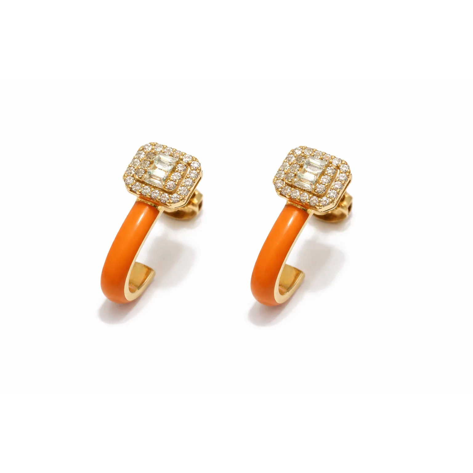 Turuncu mine yüzey ve baget kesim pırlanta detayların birleşimiyle tasarlanan bu halka küpe, enerjik ve dikkat çekici bir görünüm sunar. Kavisli mine formu kulağı zarif şekilde sararken, üst kısmındaki baget taş ve çevresindeki pırlanta dizilimi güçlü bir ışıltı oluşturur. Günlük kombinlere renk katmak için ideal bir parça olup, sade stilleri öne çıkarır. Hafif yapısı sayesinde konforlu kullanım sağlar ve farklı tarzlarla kolayca uyum yakalar.