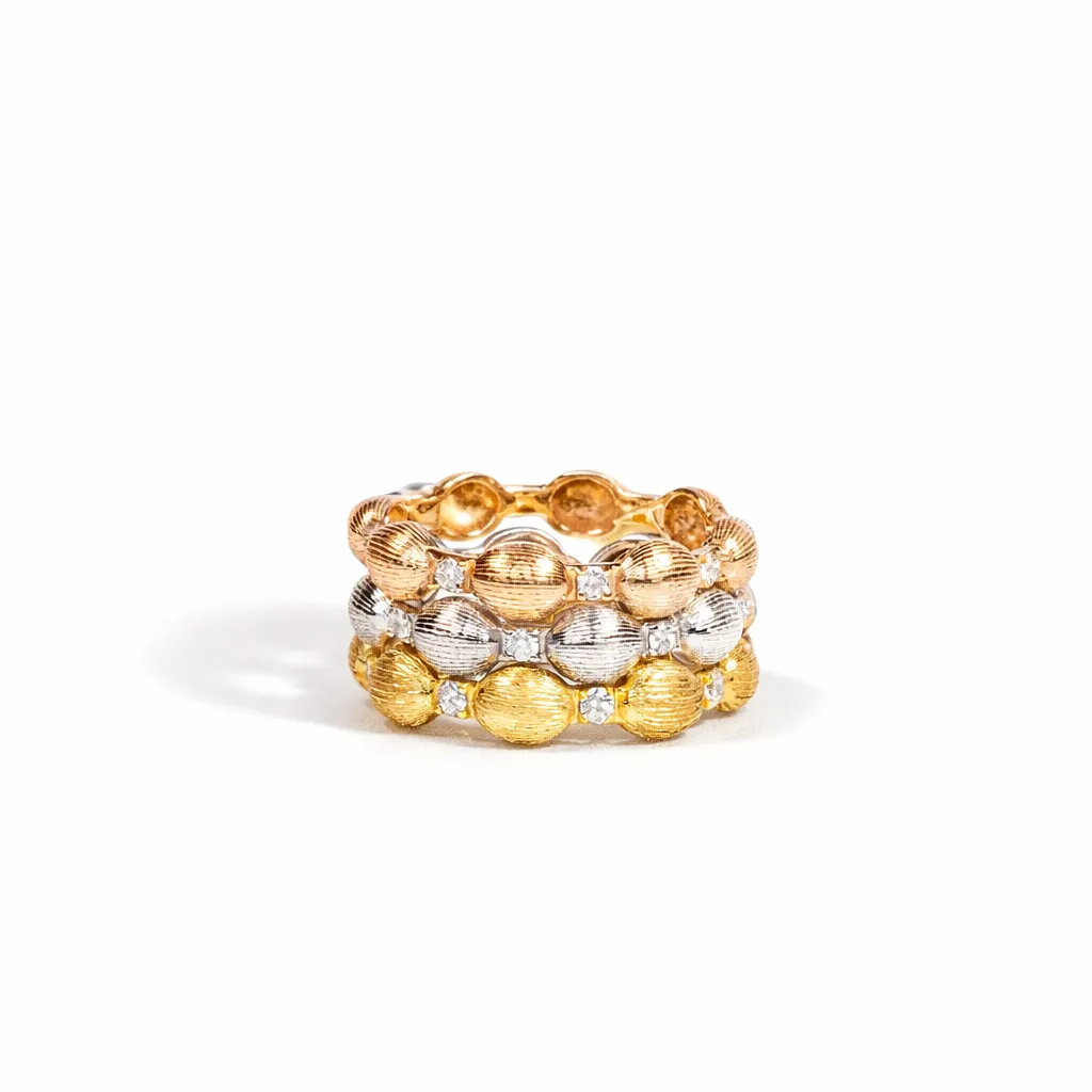 Bu yüzükler üç farklı altın tonuyla tasarlanmıştır. Sarı altın, beyaz altın ve rose gold renkleri bir arada kullanılmıştır.