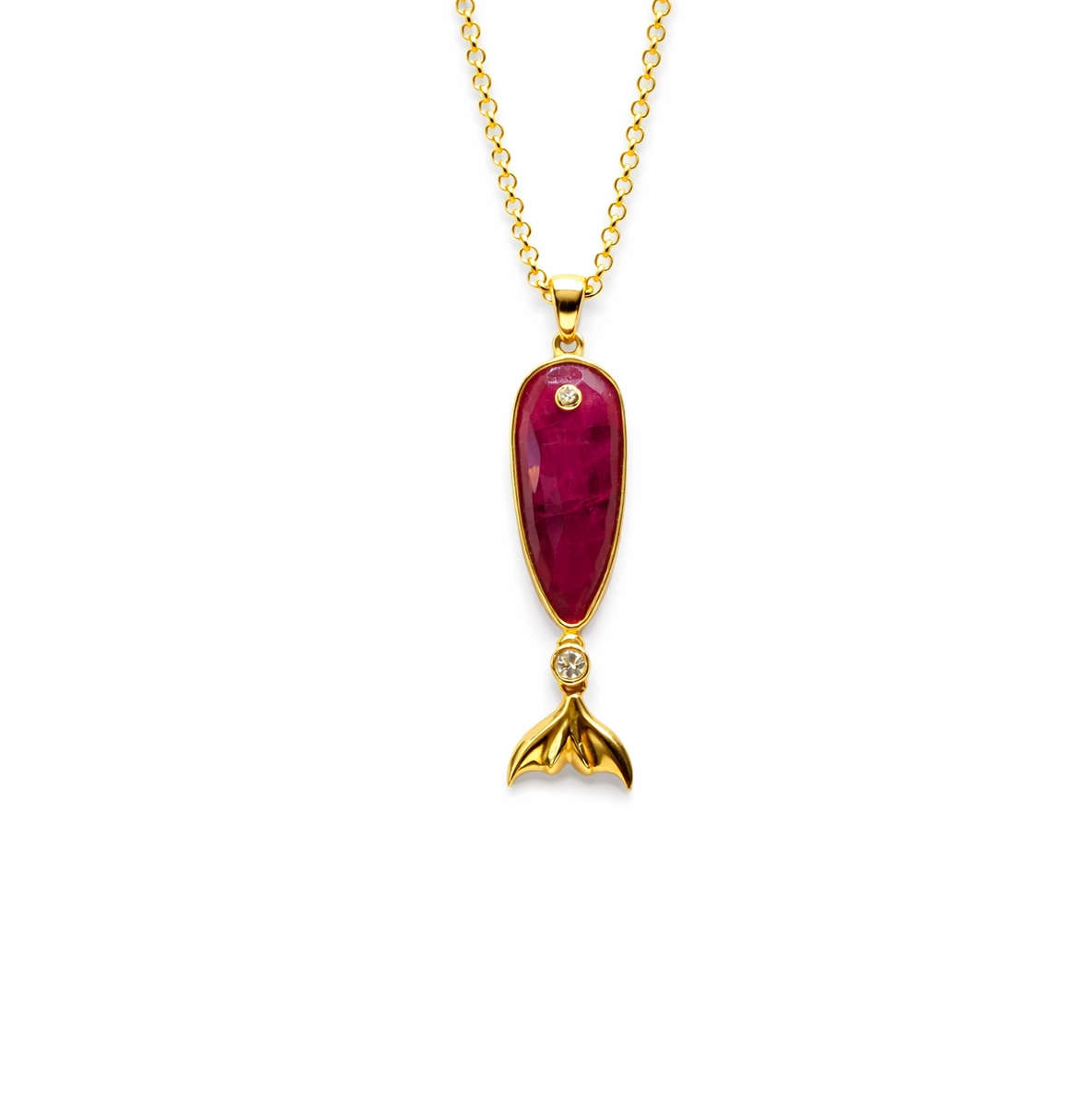 Yakut Taşlı Pırlantalı Altın Balık Kolye