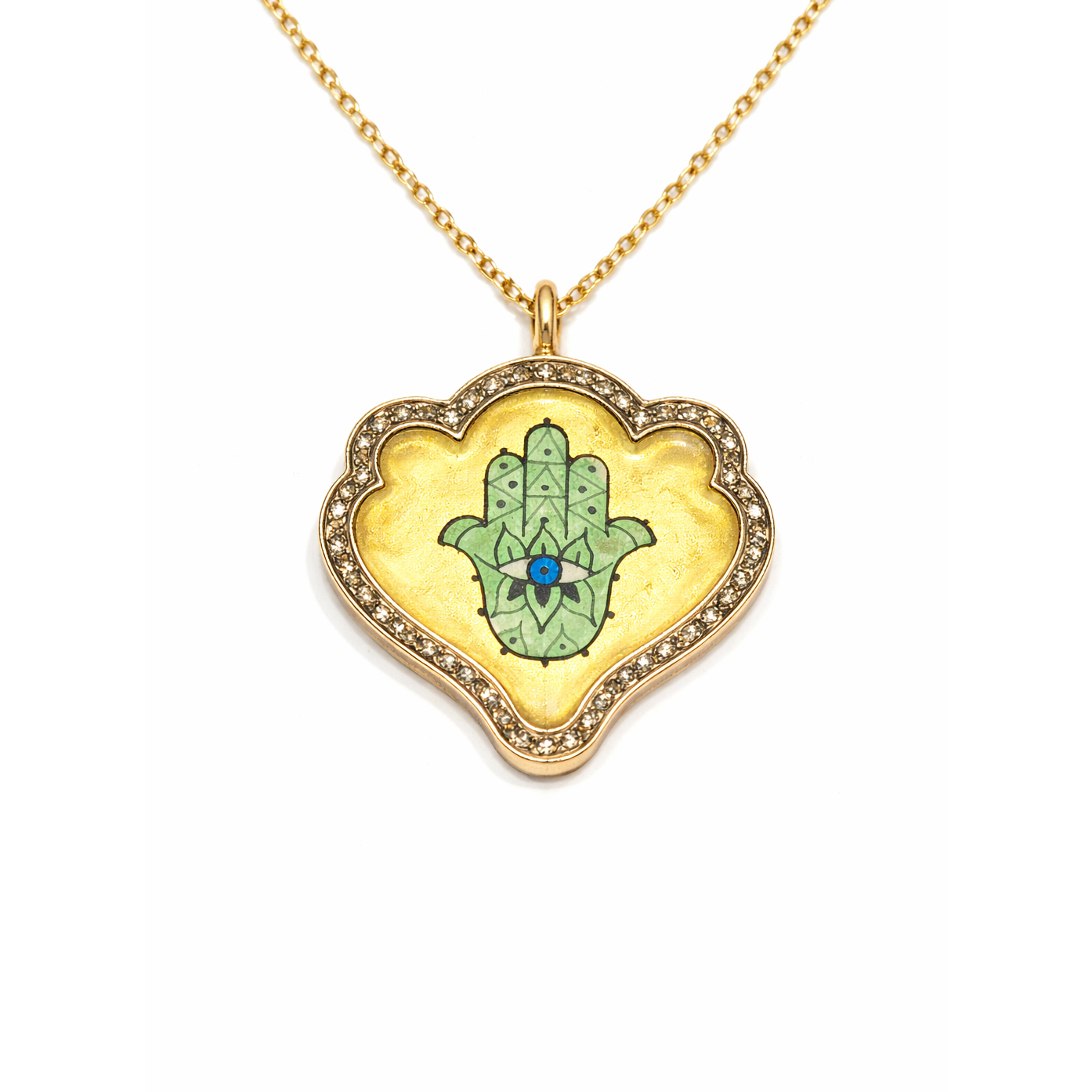 Anlam ve estetiğin zarif birleşimini yansıtan bu kolye, yeşil tonlarda işlenmiş Fatma Ana Eli (Hamsa) motifi ve nazar gözü detayıyla dikkat çeker. Altın zemin üzerine uygulanan mine tekniği, tasarıma sıcak ve sanatsal bir derinlik kazandırırken çevresindeki taş detayları kolyeye ışıltılı bir çerçeve sunar.