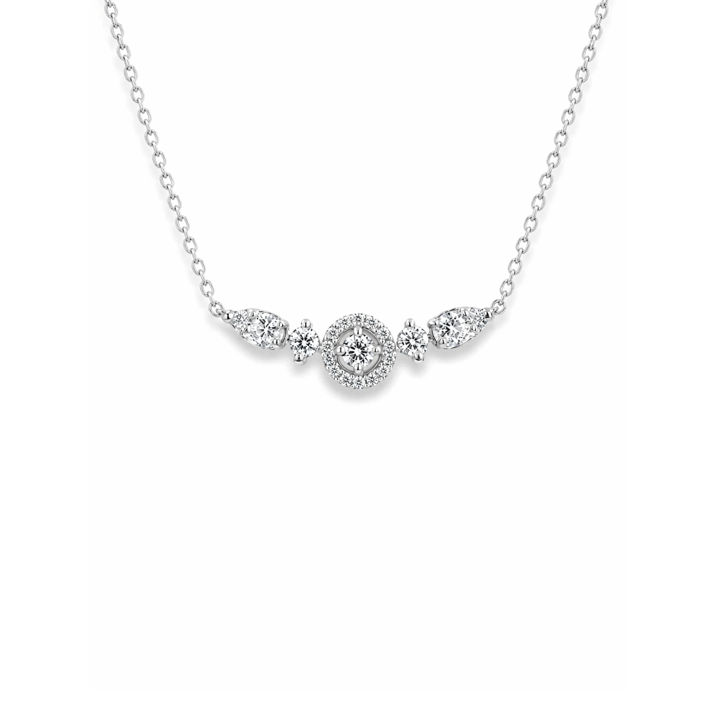 Merkezde yer alan yuvarlak pırlantanın etrafını saran halo form, bu kolyeye derinlik ve yoğun bir ışıltı kazandırır. Yanlarda konumlanan damla ve yuvarlak kesim taşlar, tasarıma dengeli ve zarif bir akış katar.