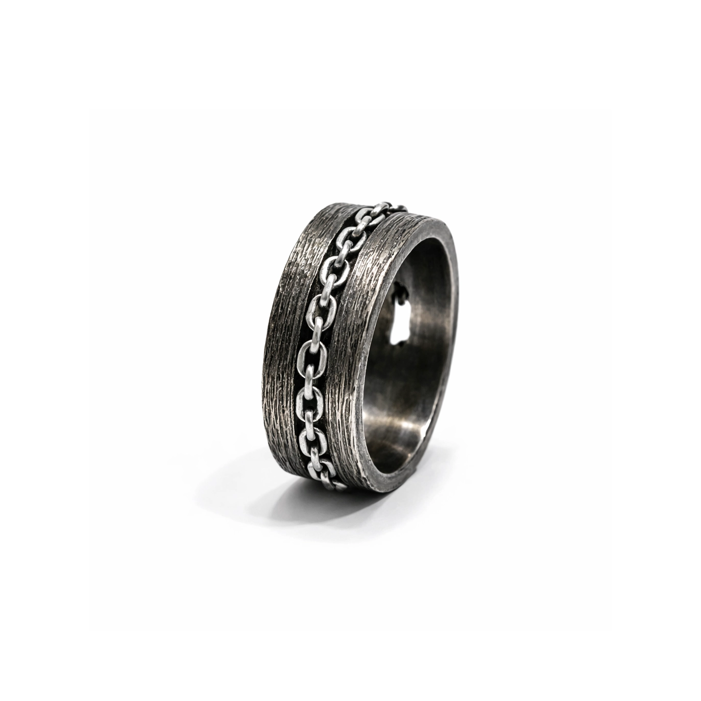 Maskülen ve güçlü tasarımıyla öne çıkan bu erkek yüzük, ortasında yer alan zincir detayıyla dikkat çekici bir stil sunar. Eskitilmiş gümüş dokusu yüzüğe vintage ve karakterli bir görünüm kazandırırken kalın ve sağlam formu güçlü bir duruş yaratır. Zincir detayının hareketli yapısı tasarıma modern ve özgün bir dokunuş ekler. Günlük kullanımda stilinizi tamamlayan bu yüzük, özellikle biker, modern ve özgün aksesuarları tercih eden erkekler için ideal bir seçimdir.