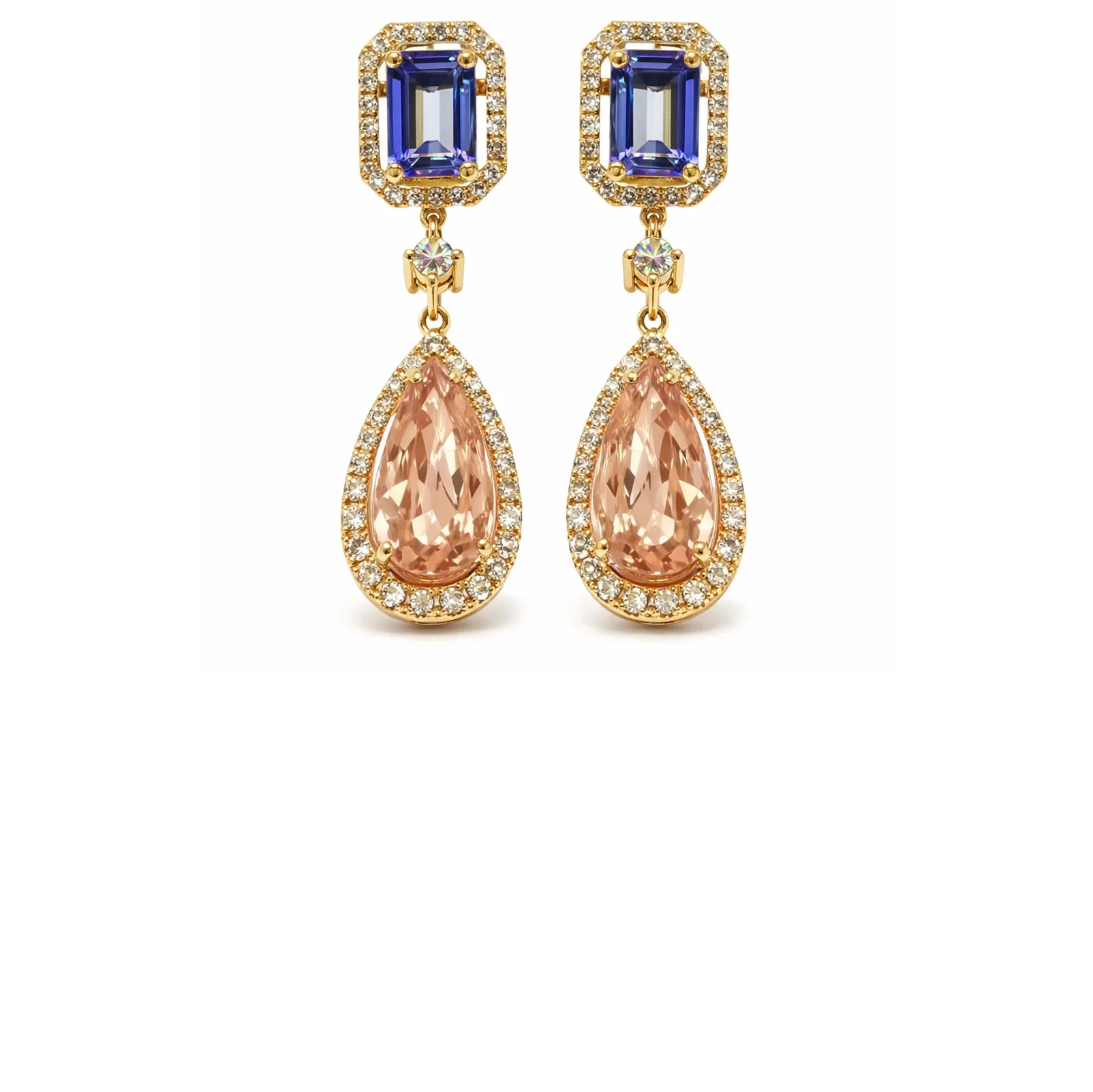 Altın Morganite ve Tanzanite Taşlı Sallantılı Küpe – Işıltılı ve Dikkat Çekici Tasarım
