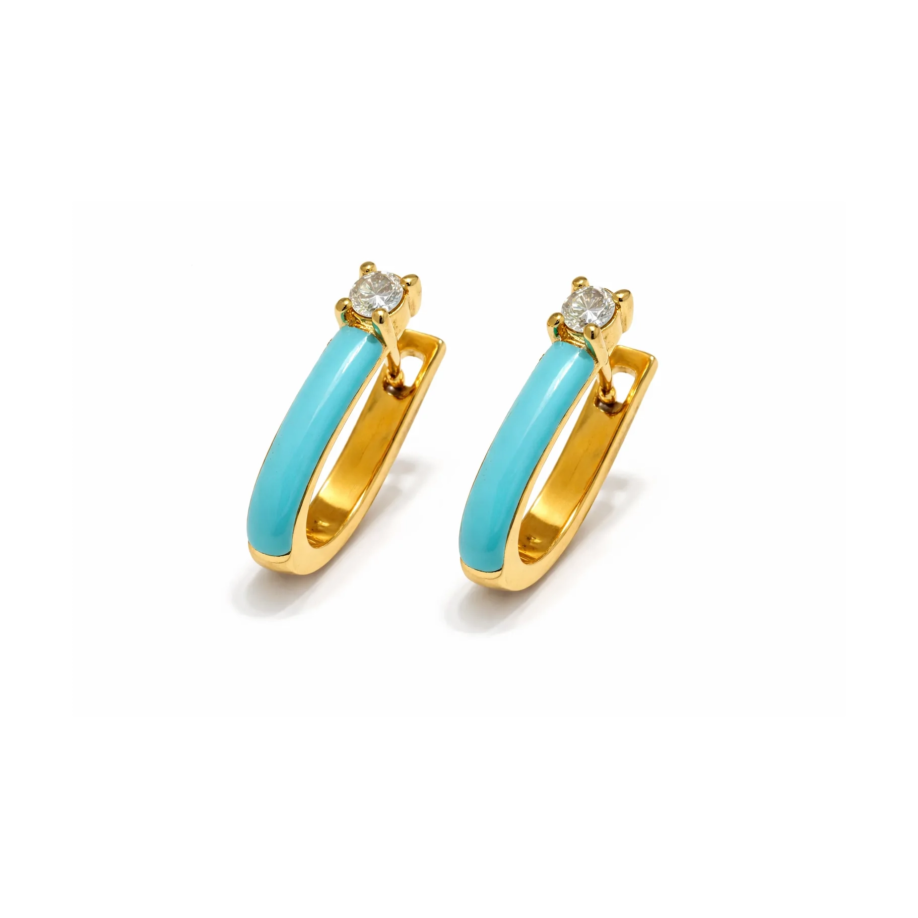 Altın ton ve turkuaz mine kaplamanın enerjik uyumuyla tasarlanan bu halka küpe, canlı ve dikkat çekici bir görünüm sunar. Kavisli formdaki turkuaz mine yüzey kulağı zarif şekilde sararken, üst kısmındaki taş detayı ışıltılı bir vurgu oluşturur. Günlük kombinlerde öne çıkan bir parça olarak kullanılabilir, sade stillere renk katmak için idealdir. Hafif yapısı sayesinde konforlu kullanım sunar ve farklı tarzlarla kolayca uyum sağlar.