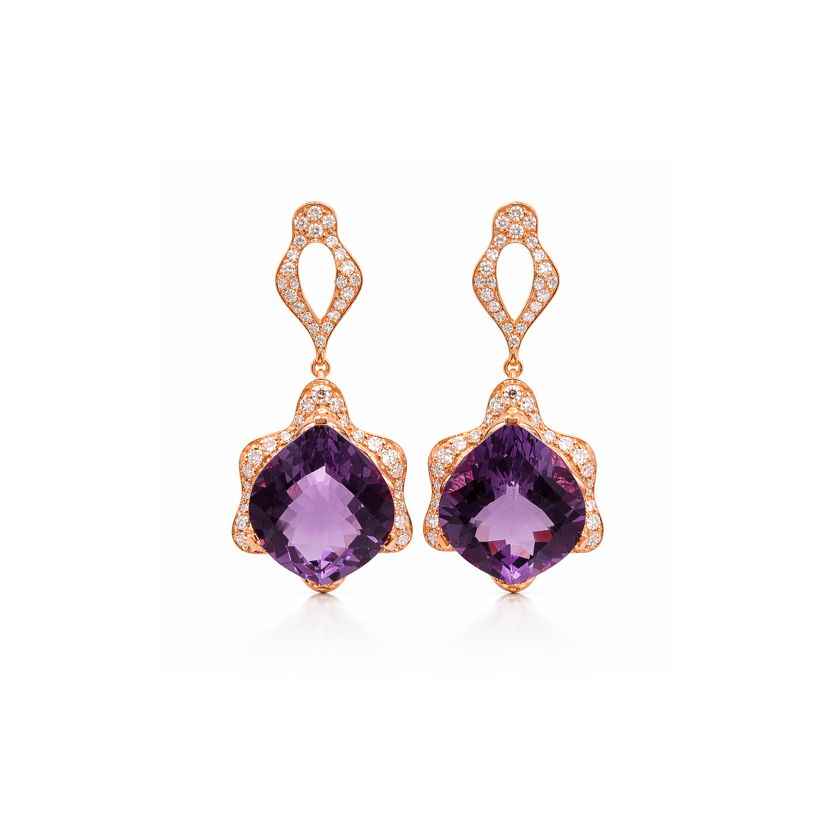 Zarafetin ve ışıltının mükemmel birleşimi olan bu ametist taşlı küpe, rose gold tonlarının sıcaklığıyla göz alıcı bir stil sunar. Özenle kesilmiş ametist taşın derin mor tonu, etrafını saran pırlanta detaylarla birlikte lüks bir görünüm kazandırır. Özel davetlerden günlük şıklığa kadar her kombine uyum sağlayan bu tasarım, feminen ve sofistike tarzı tamamlayan zamansız bir parçadır.