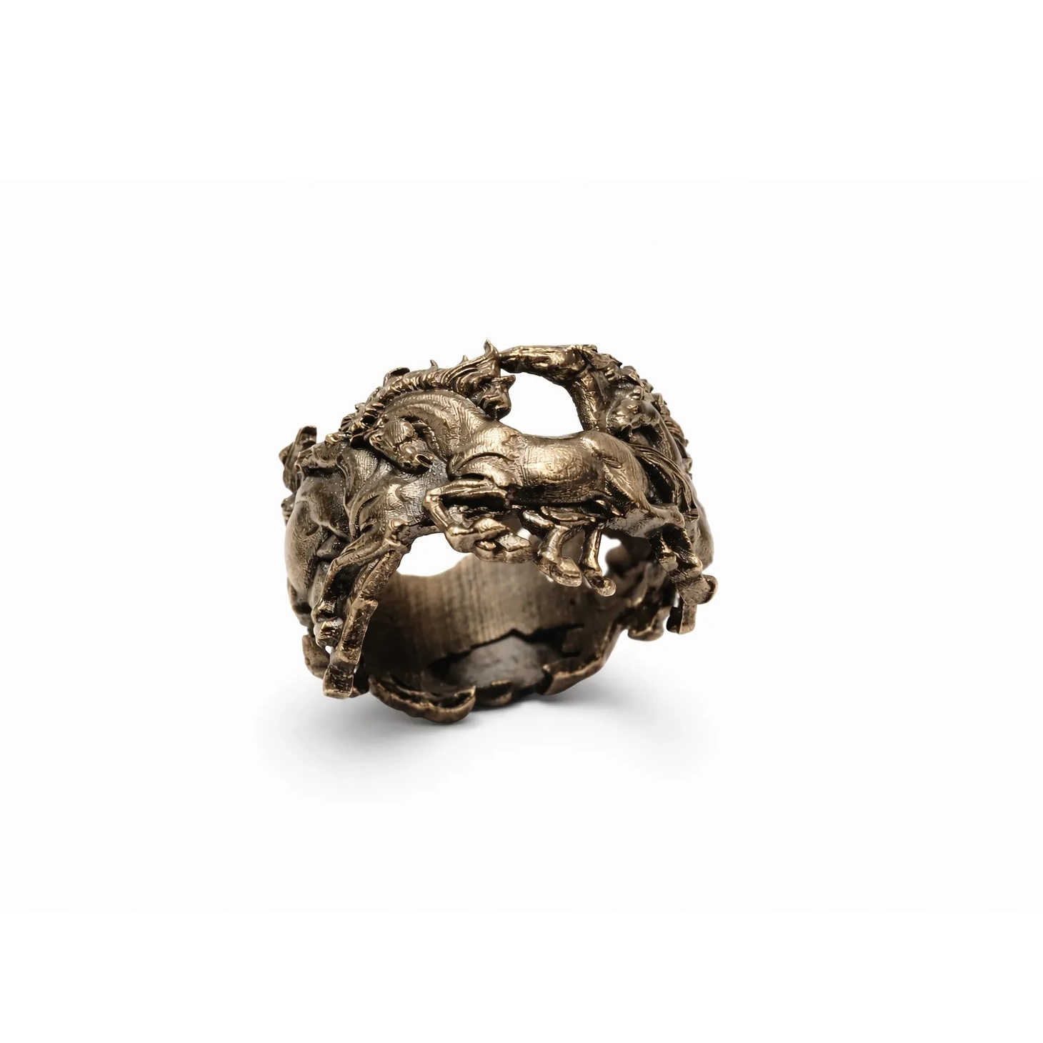 Koşan at figürlerinin dinamik formuyla tasarlanan bu yüzük, hareket ve gücü simgeleyen etkileyici bir tasarıma sahiptir. Heykelsi detayları ve oksitli yüzey dokusu sayesinde vintage ve sanatsal bir karakter sunar. Güçlü stil anlayışına sahip olanlar için dikkat çekici ve özgün bir parçadır.