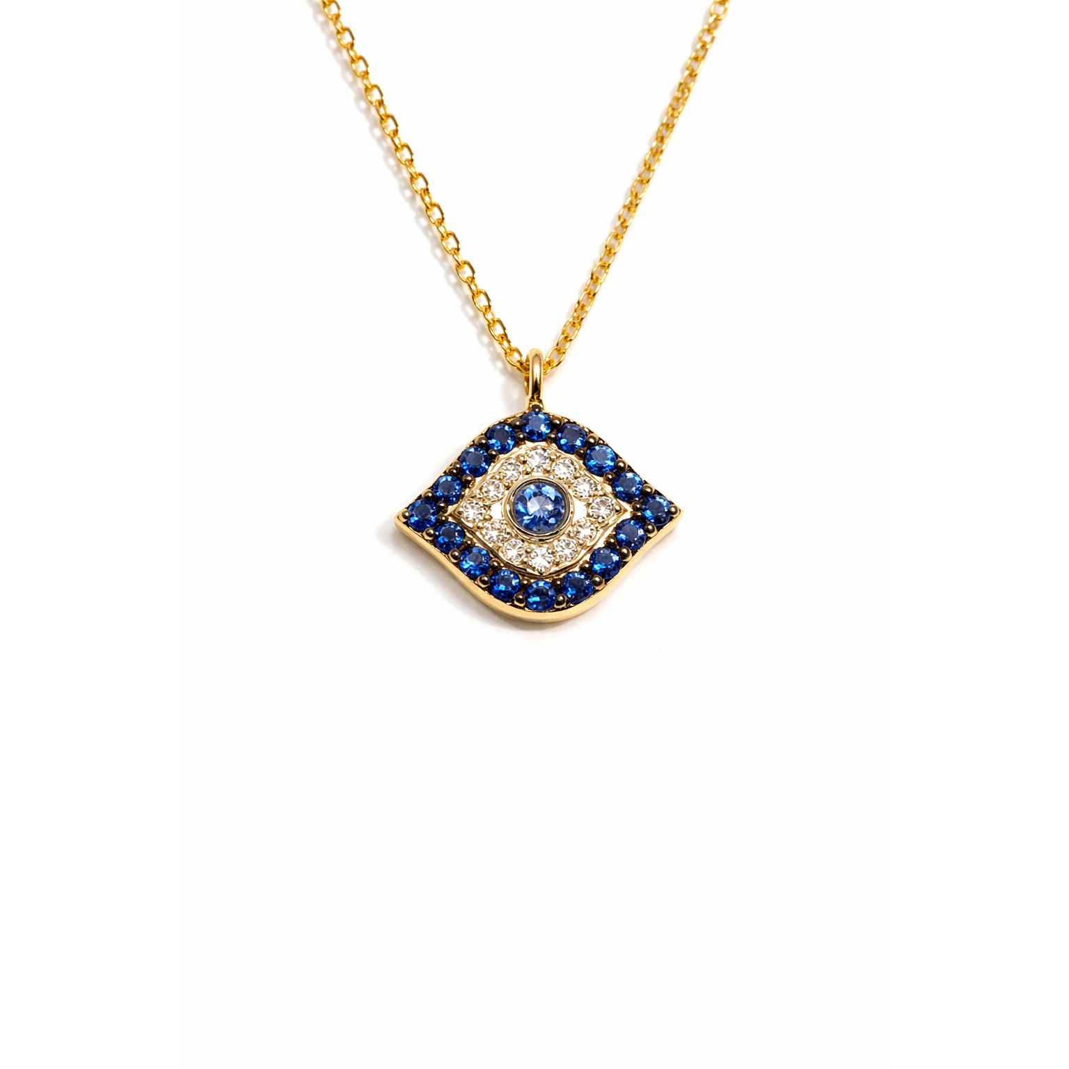 Derin mavi tonlarıyla dikkat çeken Avustralya safiri taşlarla tasarlanan bu göz boncuğu kolye, pırlanta detaylarla zenginleştirilmiş özel bir tasarımdır. Göz formundaki yapı, merkezde yer alan safir taş ve etrafını saran pırlantalar ile birlikte dengeli ve etkileyici bir görünüm sunar.