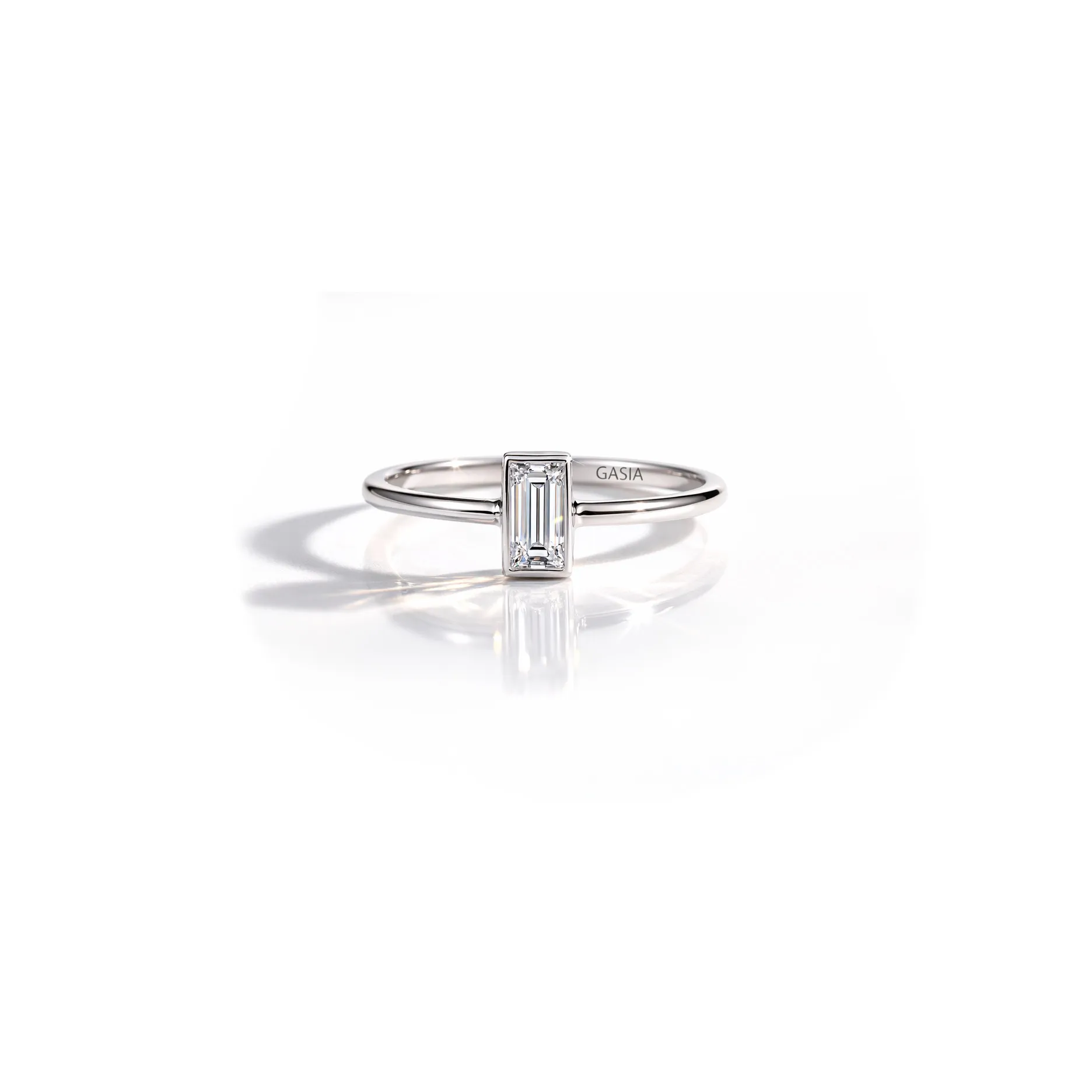 Minimal çizgilerle tasarlanan bu yüzük, beyaz altının parlaklığıyla birleşerek temiz ve şık bir duruş oluşturur. Baget kesim taşın net ve keskin hatları, ışığı etkileyici bir şekilde yansıtarak parmaklarınızda zarif bir ışıltı sağlar.