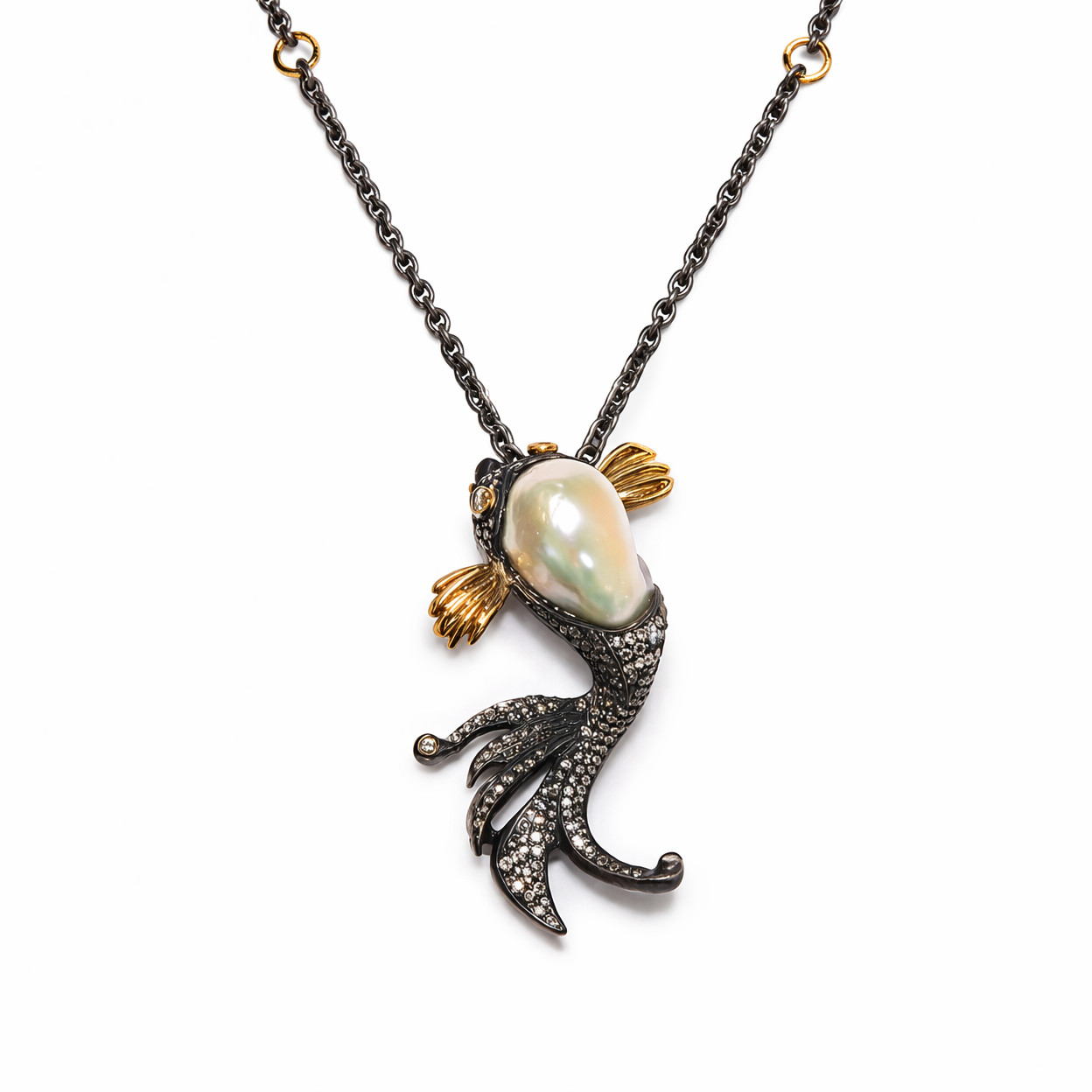 Barok inci gövdeye sahip balık formu kolye, pırlanta detaylarla hareket kazanır. Farklı tasarımıyla öne çıkan dikkat çekici bir parçadır.