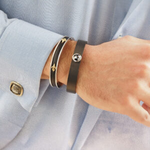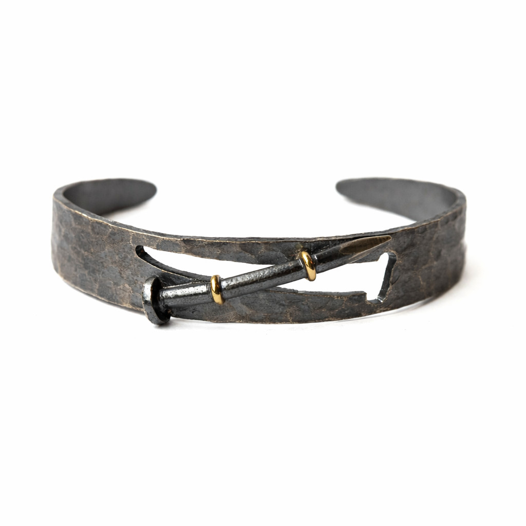 Endüstriyel esintiler taşıyan bu tasarım, merkezindeki çivi form detayıyla güçlü ve farklı bir karakter sunar. Oksitli gümüş yüzeyi ve kontrast yaratan altın ton dokunuşları, bilekliğe dikkat çekici bir duruş kazandırır.