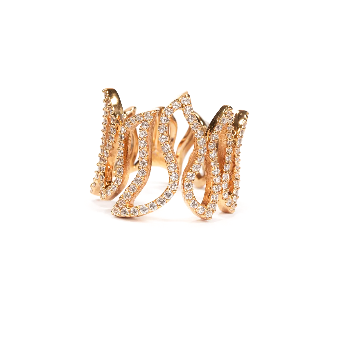 Akışkan ve dinamik hatlarıyla dikkat çeken bu yüzük, dalga formundan ilham alan özgün tasarımıyla modern bir şıklık sunar. Birbiriyle uyumlu kıvrımlı yüzeyler boyunca yerleştirilen pırlanta taşlar, yüzüğe çok boyutlu ve etkileyici bir ışıltı kazandırır.
