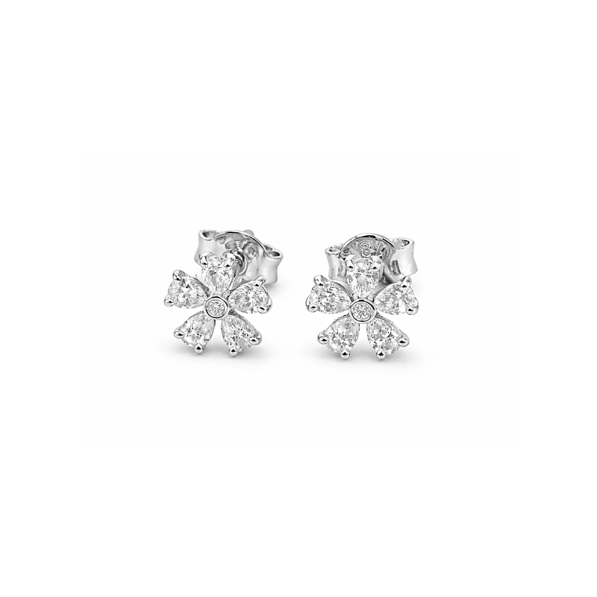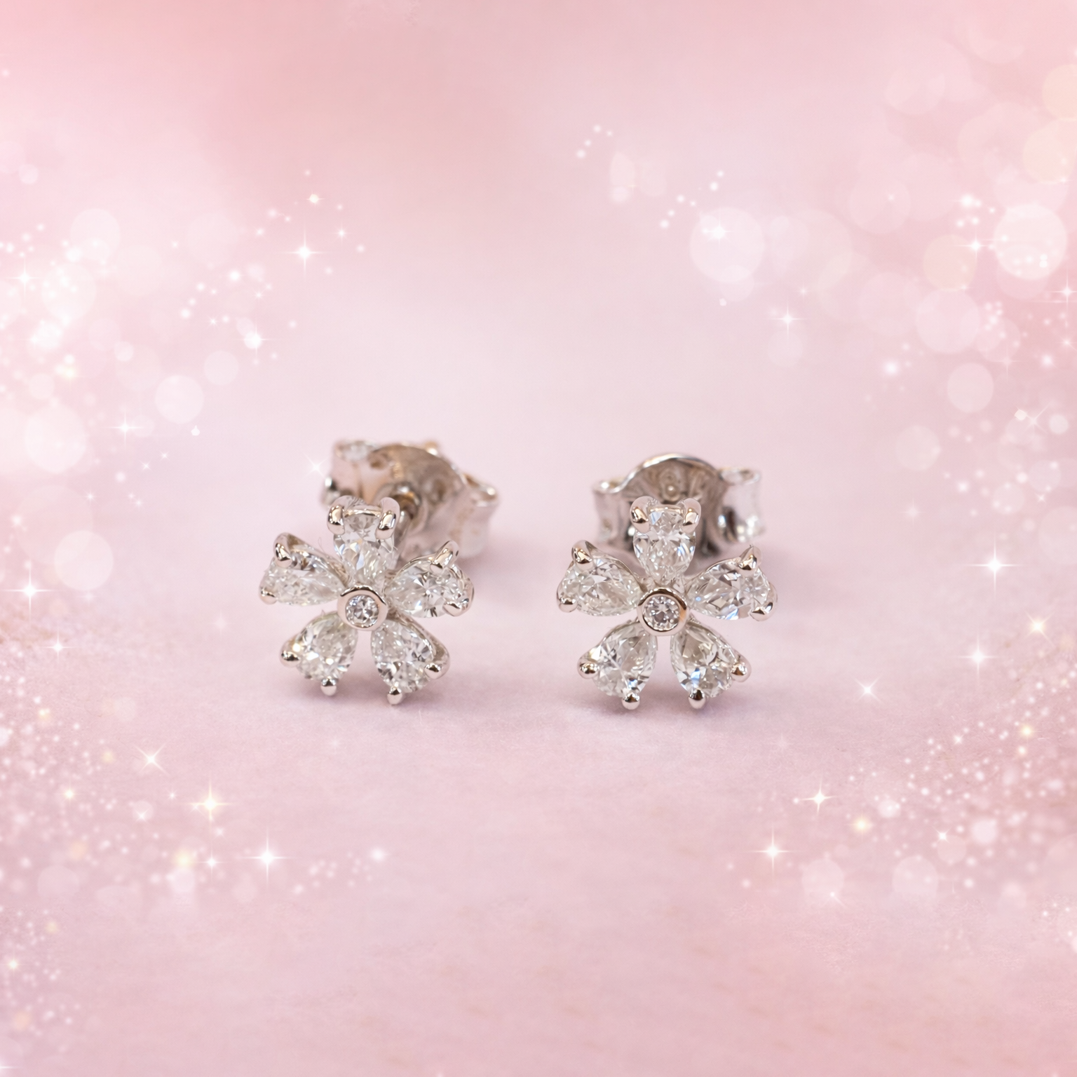 Damla kesim taşların çiçek formunda bir araya gelmesiyle tasarlanan bu pırlanta küpe, ışığı güçlü şekilde yansıtan yapısıyla dikkat çeker. Her bir taşın özenle yerleştirildiği form, merkezdeki detayla birlikte dengeli ve estetik bir görünüm sunar.