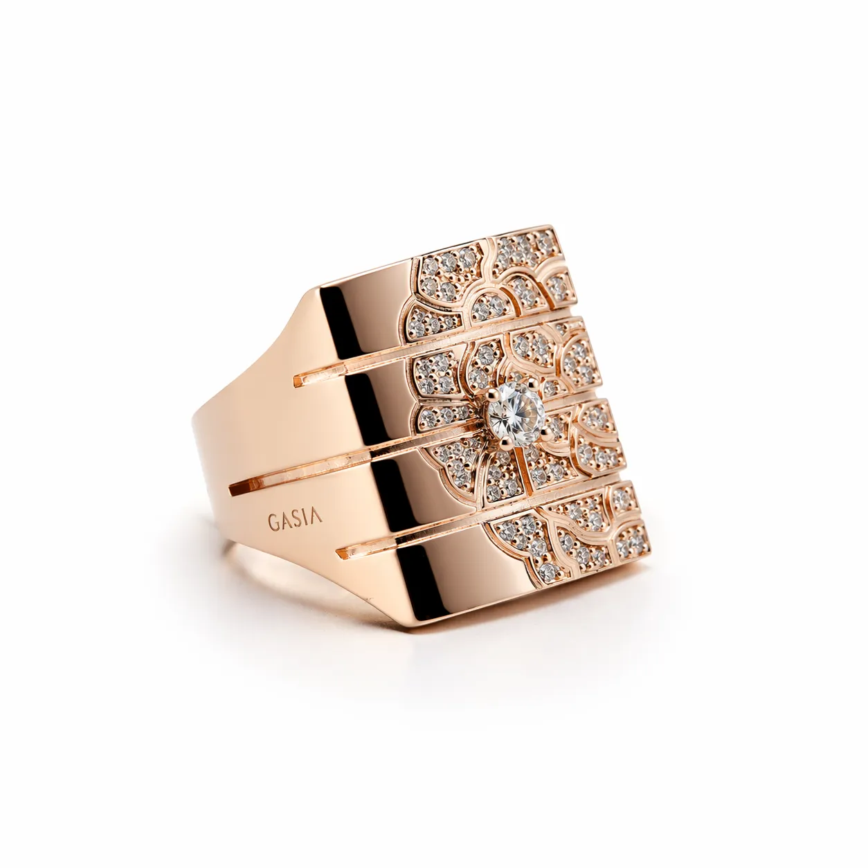 Geniş yüzey üzerine işlenen geometrik desenler, yüzüğe karakteristik bir doku kazandırırken; merkezde yer alan pırlanta, tasarımın odak noktasını oluşturur. Katmanlı yapısı sayesinde ışığı farklı açılardan yansıtan yüzeyler, derinlik hissini güçlendirir ve etkileyici bir görünüm sunar.