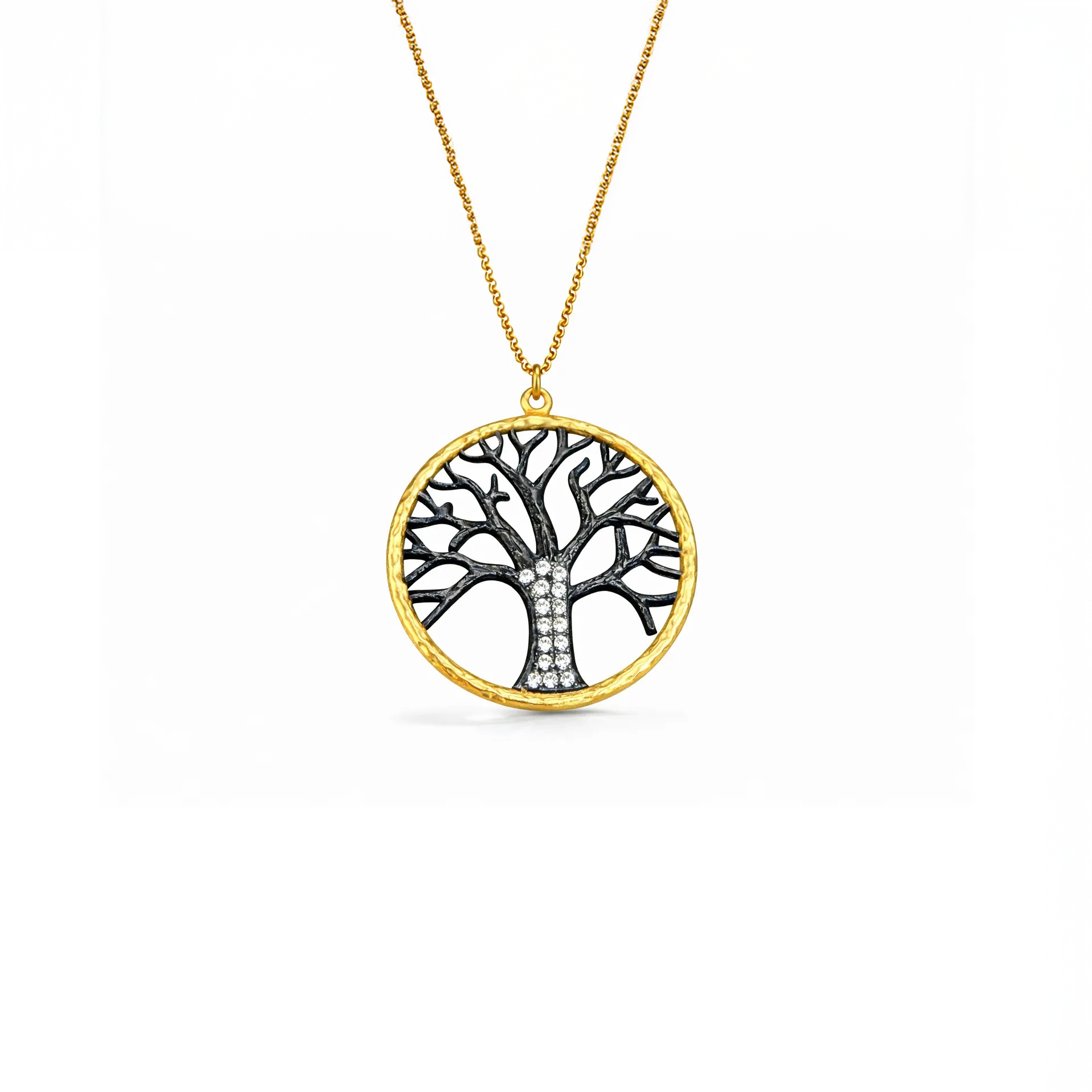 Gücü, kökleri ve yeniden doğuşu simgeleyen hayat ağacı motifi, bu özel kolyede modern bir yorumla hayat buluyor. Siyah detaylarla vurgulanan ağaç formu ve gövdedeki taş süslemeler, tasarıma derinlik ve karakter kazandırır. Altın çerçeve ise parçaya sıcak ve dikkat çekici bir kontrast ekler.