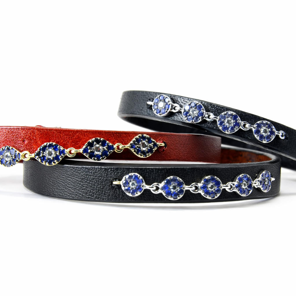 Zarif ve anlam yüklü tasarımıyla öne çıkan bu kahverengi deri bileklik, safir ve pırlanta taşlarla oluşturulmuş nazarlık formu ile dikkat çeker. Derinin sıcak tonları ile safirin derin mavi ışıltısı birleşerek güçlü bir kontrast yaratırken, pırlanta detaylar tasarıma ince bir parlaklık katar. İnce yapısı sayesinde bilekte hafif ve şık bir duruş sunan bu parça, hem günlük kullanımda hem de özel anlarda stilinize anlamlı bir dokunuş ekler. Modern çizgilerle yorumlanan nazarlık detayı, koruyucu sembolizmi zarif bir estetikle buluşturur.