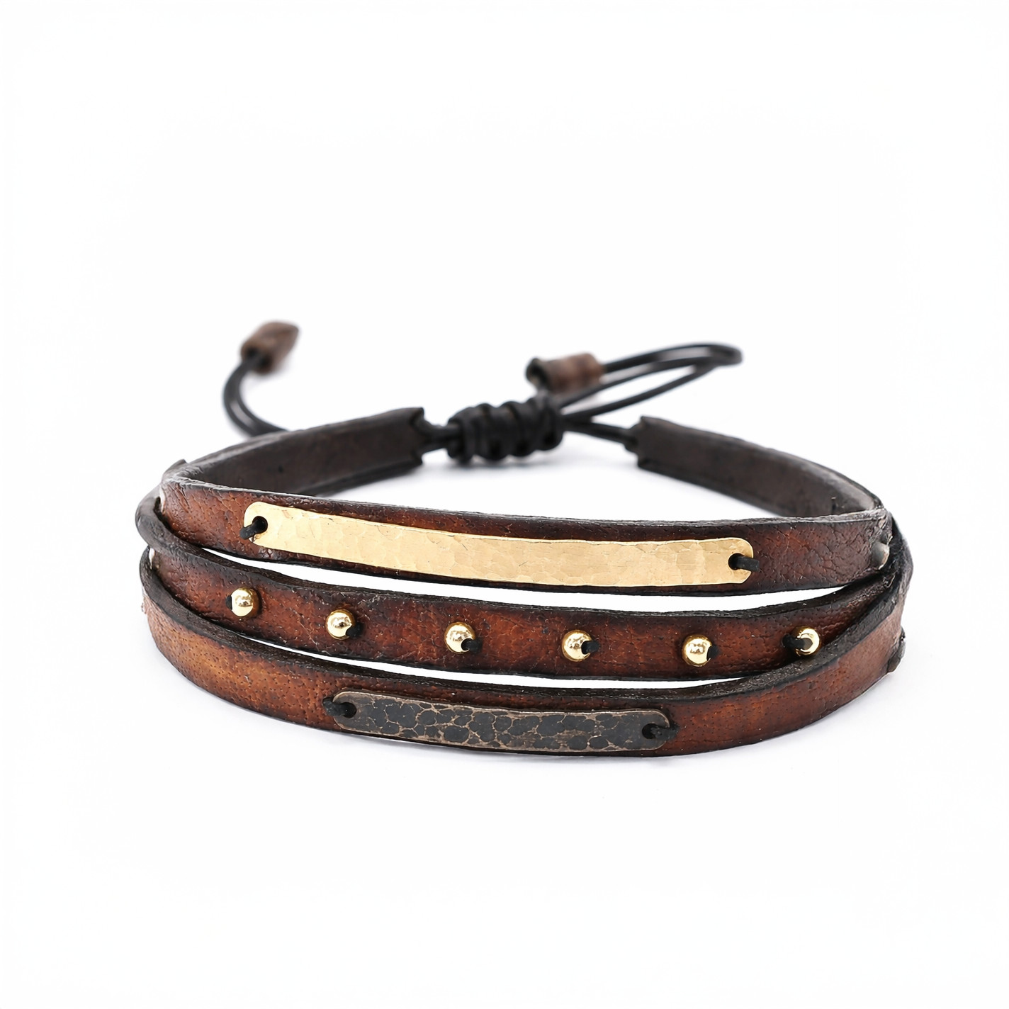 Kahverengi deri zemin üzerine yerleştirilen sarı altın ve okside altın plakalar, bilekliğe karakterli ve güçlü bir görünüm kazandırır. Minimal detaylarla zenginleşen tasarım, günlük kullanıma uygun yapısıyla öne çıkar. Ayarlanabilir ipli kapanışı sayesinde konforlu ve pratik kullanım sunar.