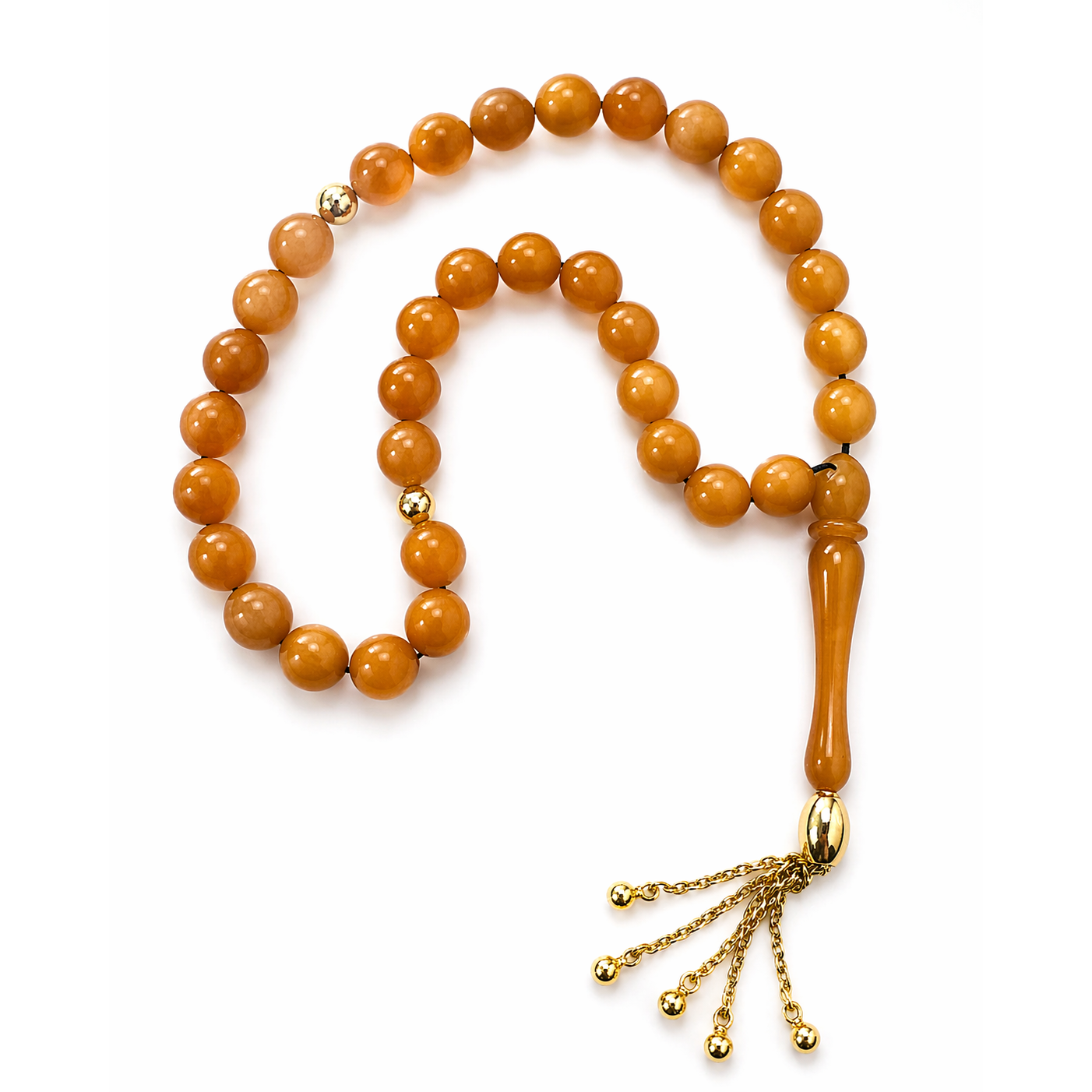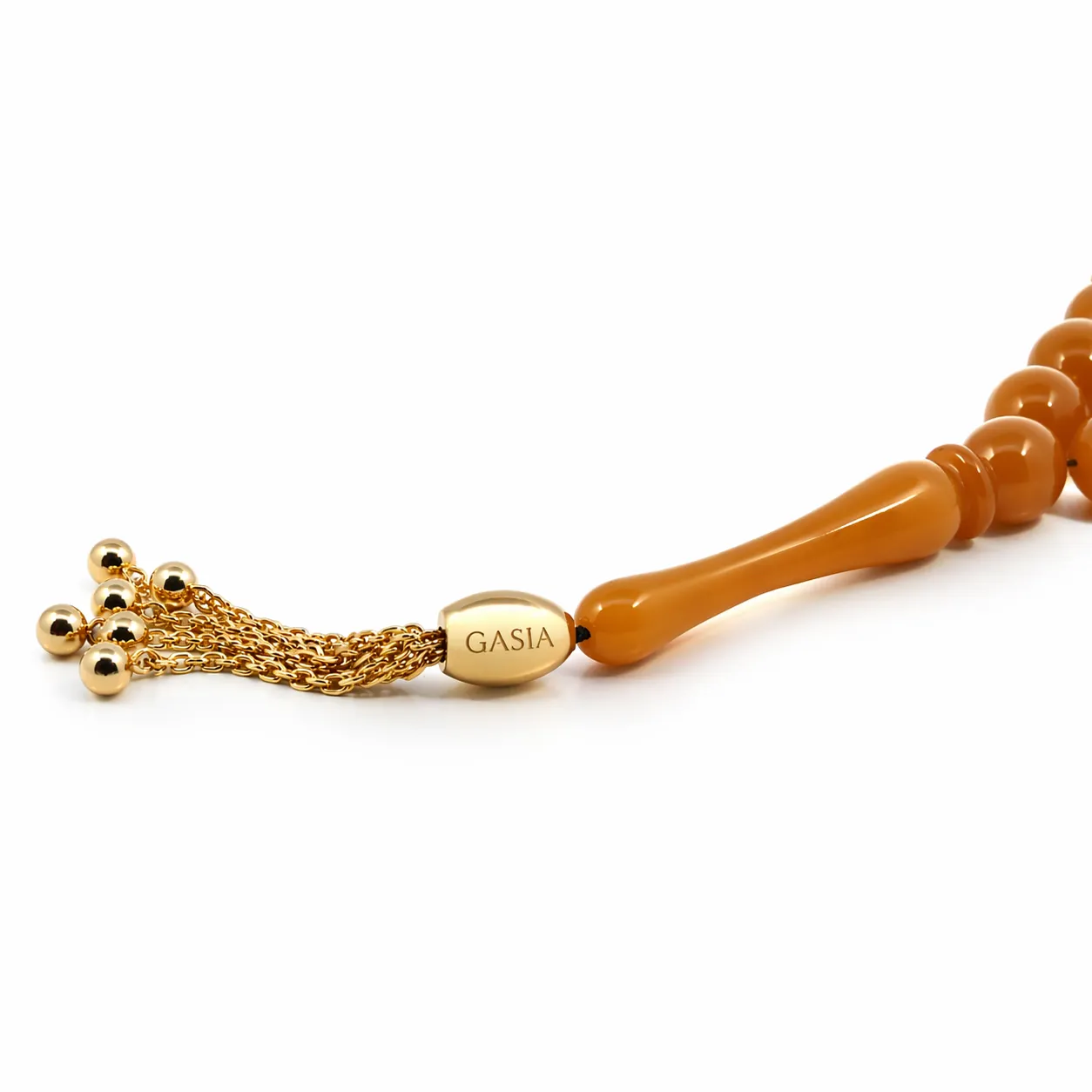 Akıcı formdaki kehribar taneler, elde dengeli ve rahat bir kullanım sunarken; uç kısmında yer alan altın detaylı püskül tasarıma hareket ve şıklık kazandırır. Parlak yüzeyler ve yumuşak geçişler, tesbihin estetik bütünlüğünü güçlendirir.