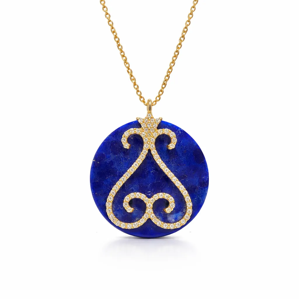 Derin mavi lapis taşı üzerine işlenen tuğra formu ve pırlanta detaylarıyla tasarlanan bu kolye, güçlü bir karakter ve dikkat çekici bir stil sunar. Altın zincir ile tamamlanan tasarım, klasik motifleri modern bir yorumla bir araya getirerek özel anlar ve günlük kullanım için ideal bir seçenek oluşturur.