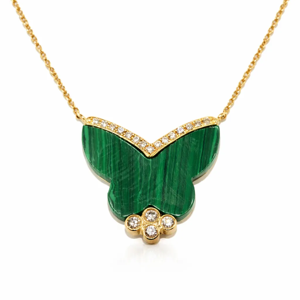 Doğanın eşsiz dokusunu yansıtan malakit taş, kelebek formuyla bu özel kolyede hayat buluyor. Yeşilin doğal damarları sayesinde her parça benzersiz bir görünüm sunarken, altın ve pırlanta detaylar tasarıma zarif bir ışıltı katar.