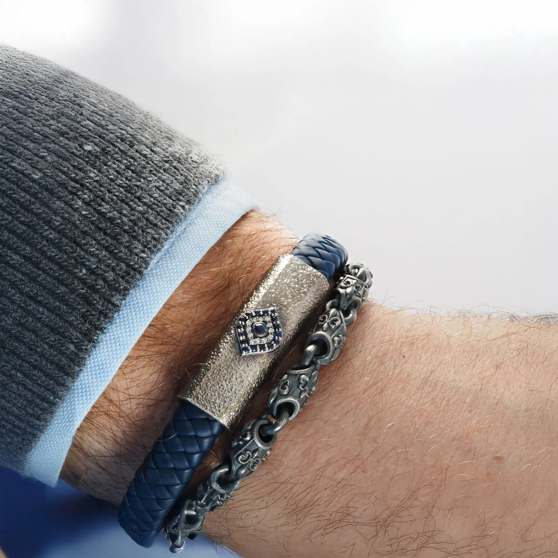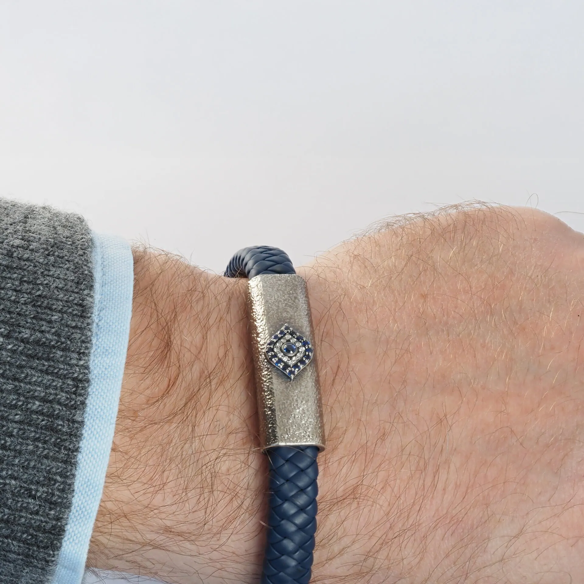 Mavi örgü deri ve nazar detaylı gümüş yüzeyiyle dikkat çeken bu bileklik, güçlü ve net bir stil sunar. Canlı mavi ton, ortadaki nazar motifiyle birleşerek tasarıma enerjik bir görünüm kazandırır.