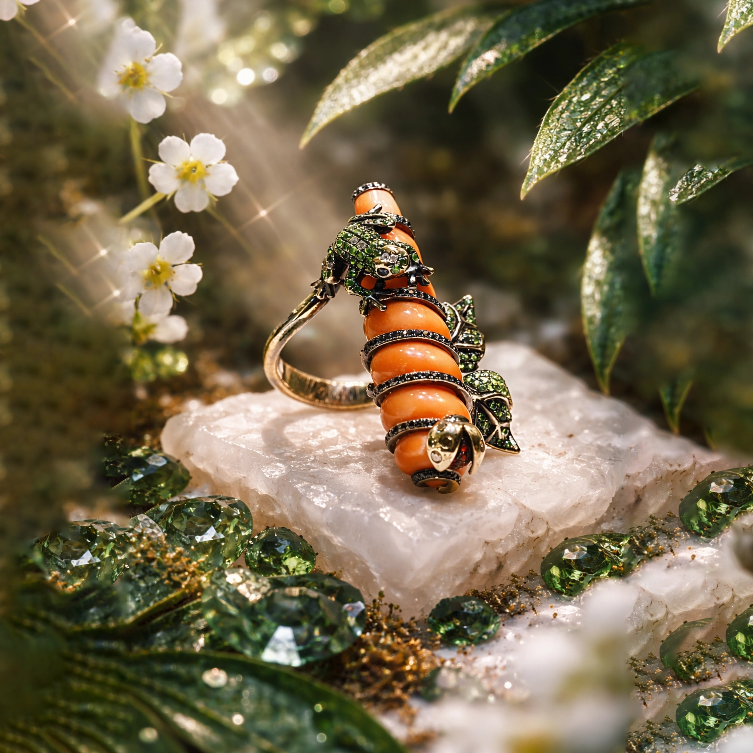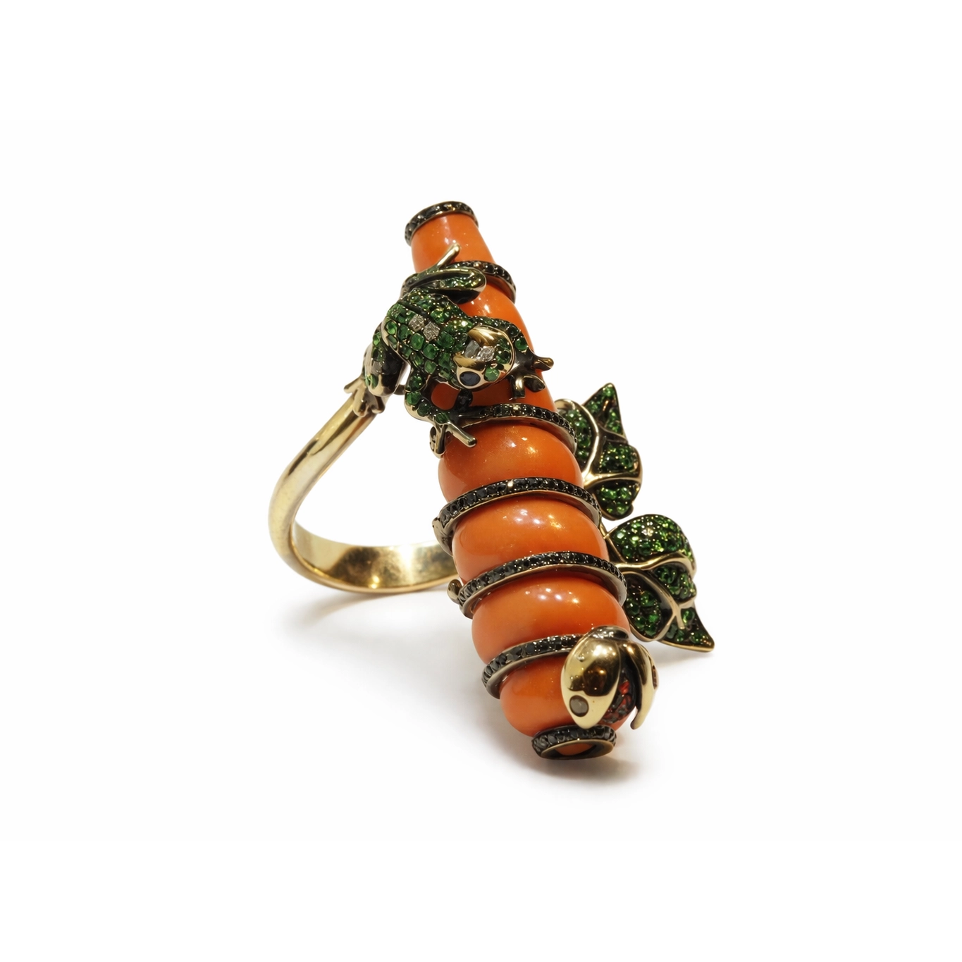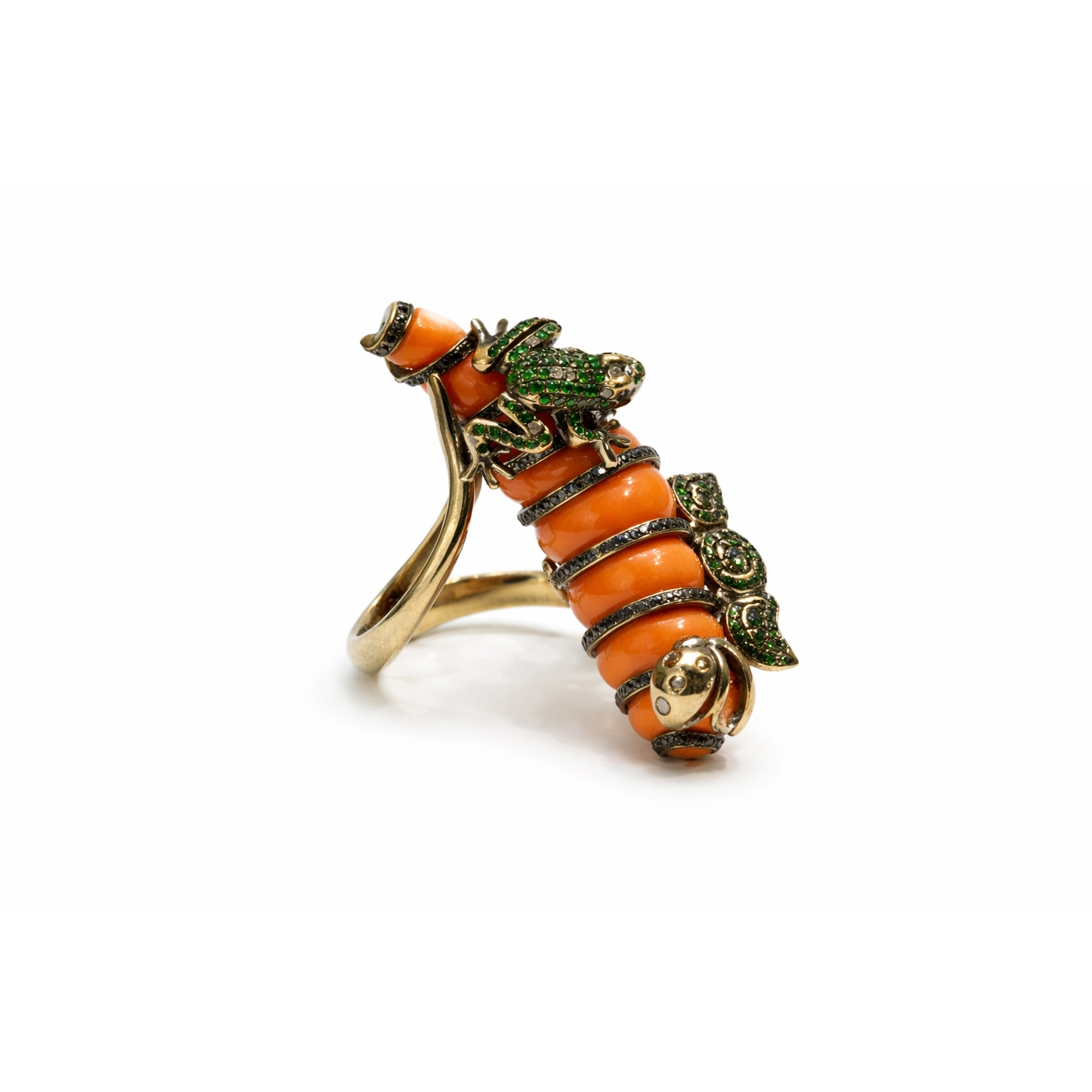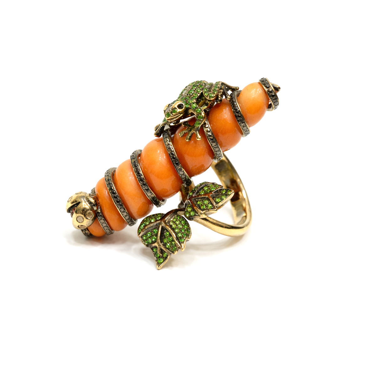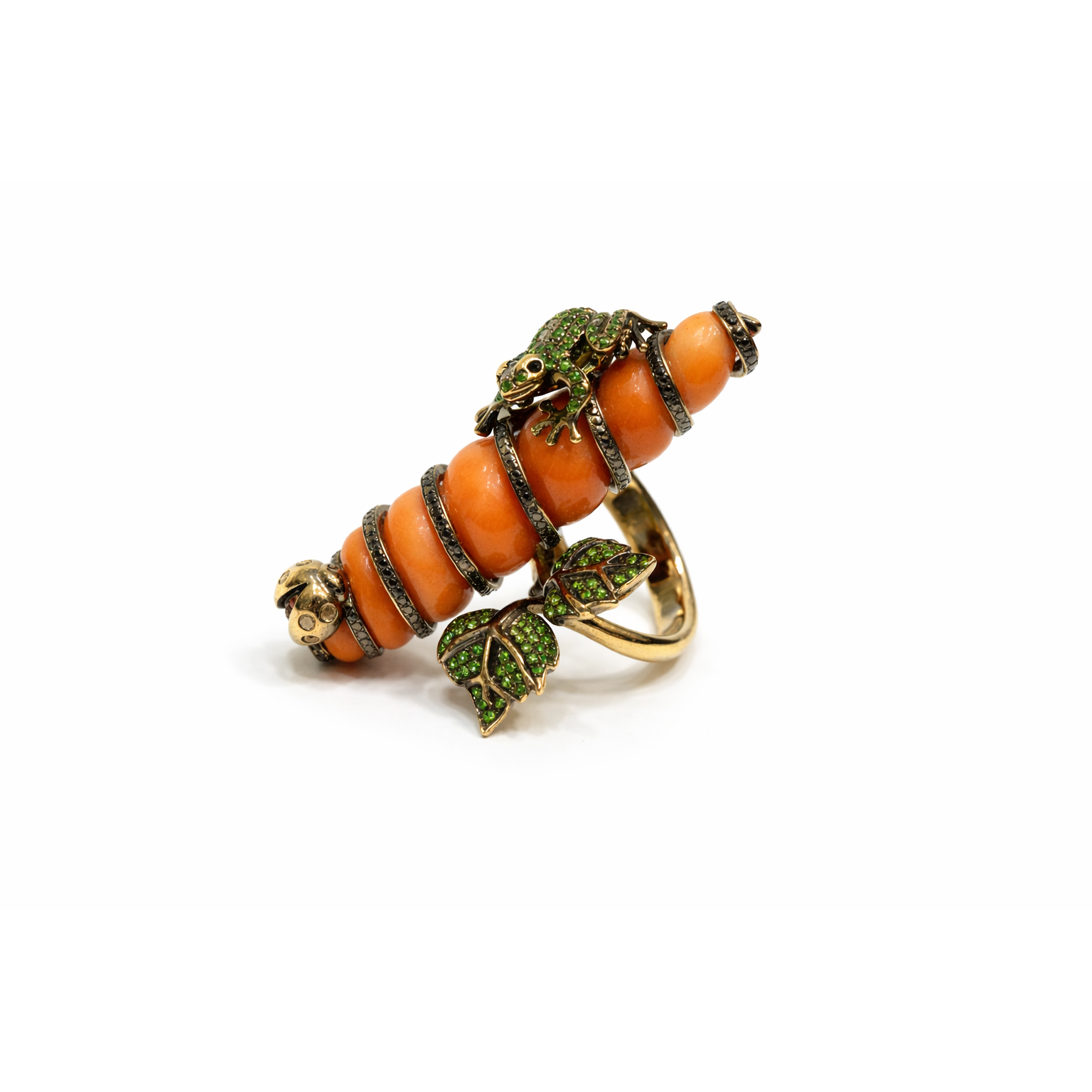 Özgün tasarımıyla öne çıkan bu mercan formlu yüzük, doğadan ilham alan figürleriyle dikkat çekici bir stil sunar. Canlı turuncu tonlardaki mercan formunun üzerinde konumlanan kurbağa ve uğur böceği figürleri, yeşil taş detaylarla zenginleştirilerek güçlü bir görsel etki oluşturur.