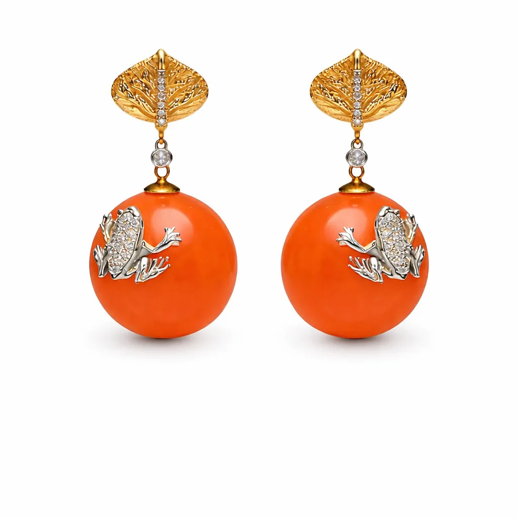 Canlı mercan tonlarıyla dikkat çeken bu küpe, doğadan ilham alan kurbağa figürü ve pırlanta detaylarla özgün bir tasarım sunar. Parlak yüzeye sahip mercan küre formu, tasarıma güçlü ve enerjik bir görünüm kazandırır.