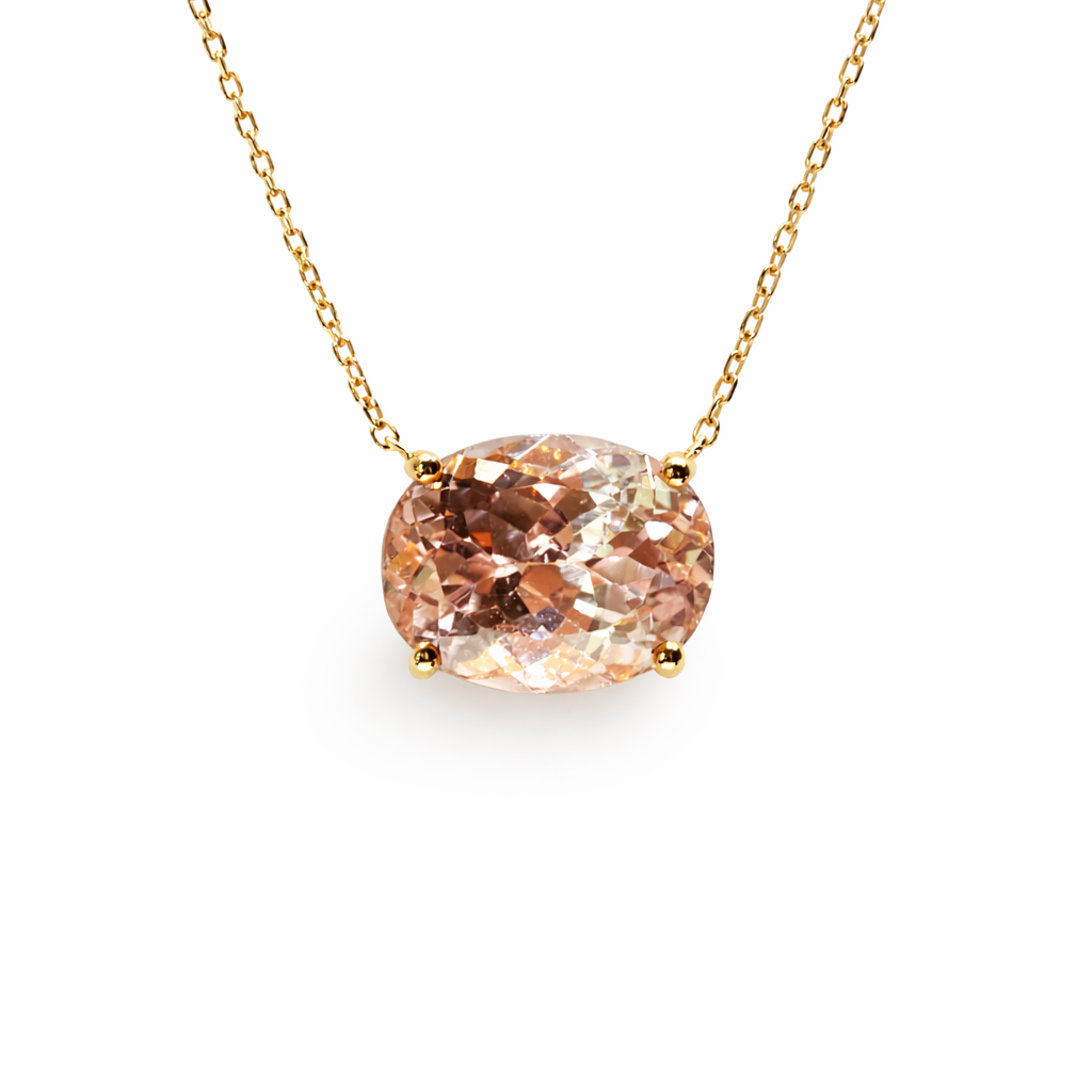 Yumuşak pembe tonlarıyla öne çıkan morganit taşı, sade altın montürle bir araya gelerek dengeli ve dikkat çekici bir görünüm sunar. Oval kesimi sayesinde ışığı farklı açılardan yansıtarak taşın doğal ışıltısını ortaya çıkarır. Tek başına güçlü bir etki yaratan bu kolye, hem günlük kullanımda hem özel anlarda rahatlıkla tercih edilebilir.