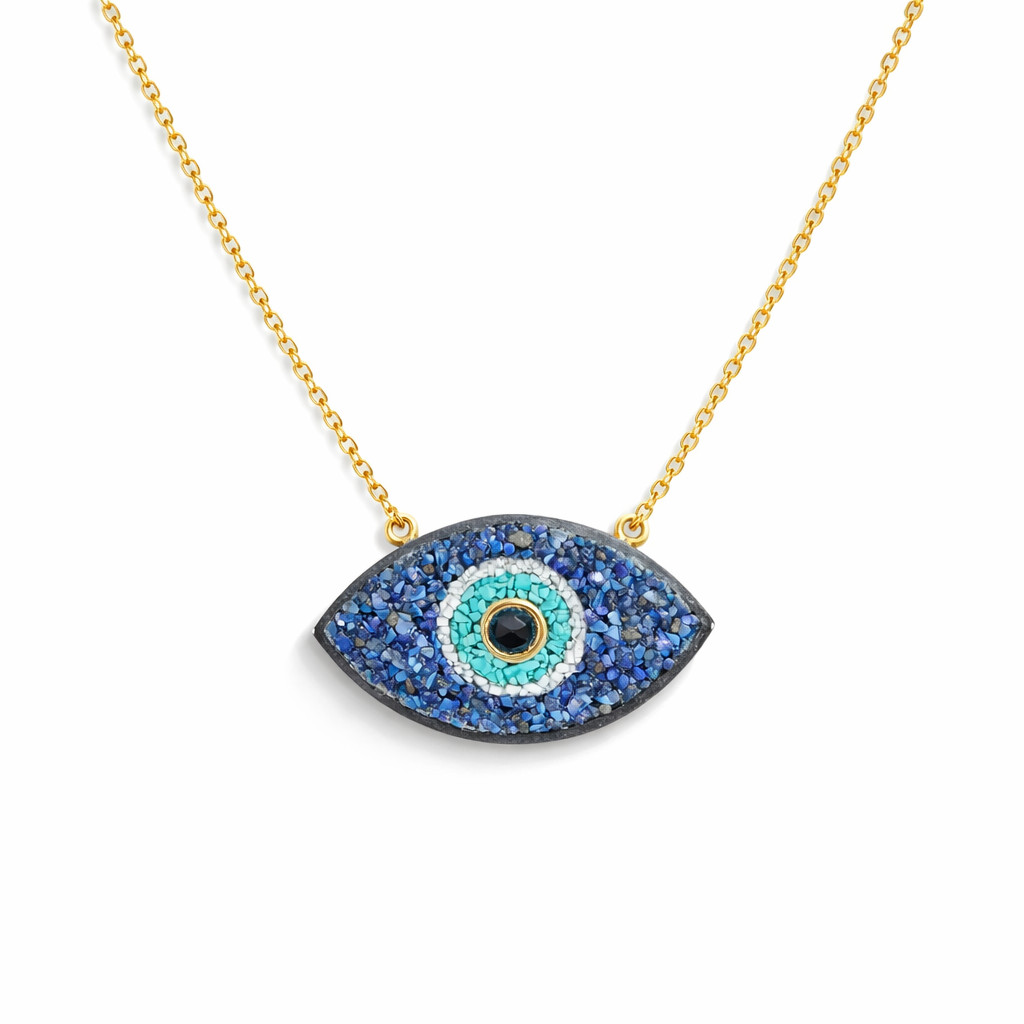 Mavi Safir Taşlı Nazar Boncuğu Motifli Pırlanta Detaylı Altın Kolye
