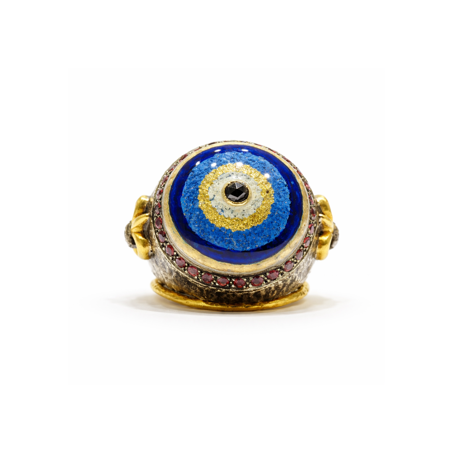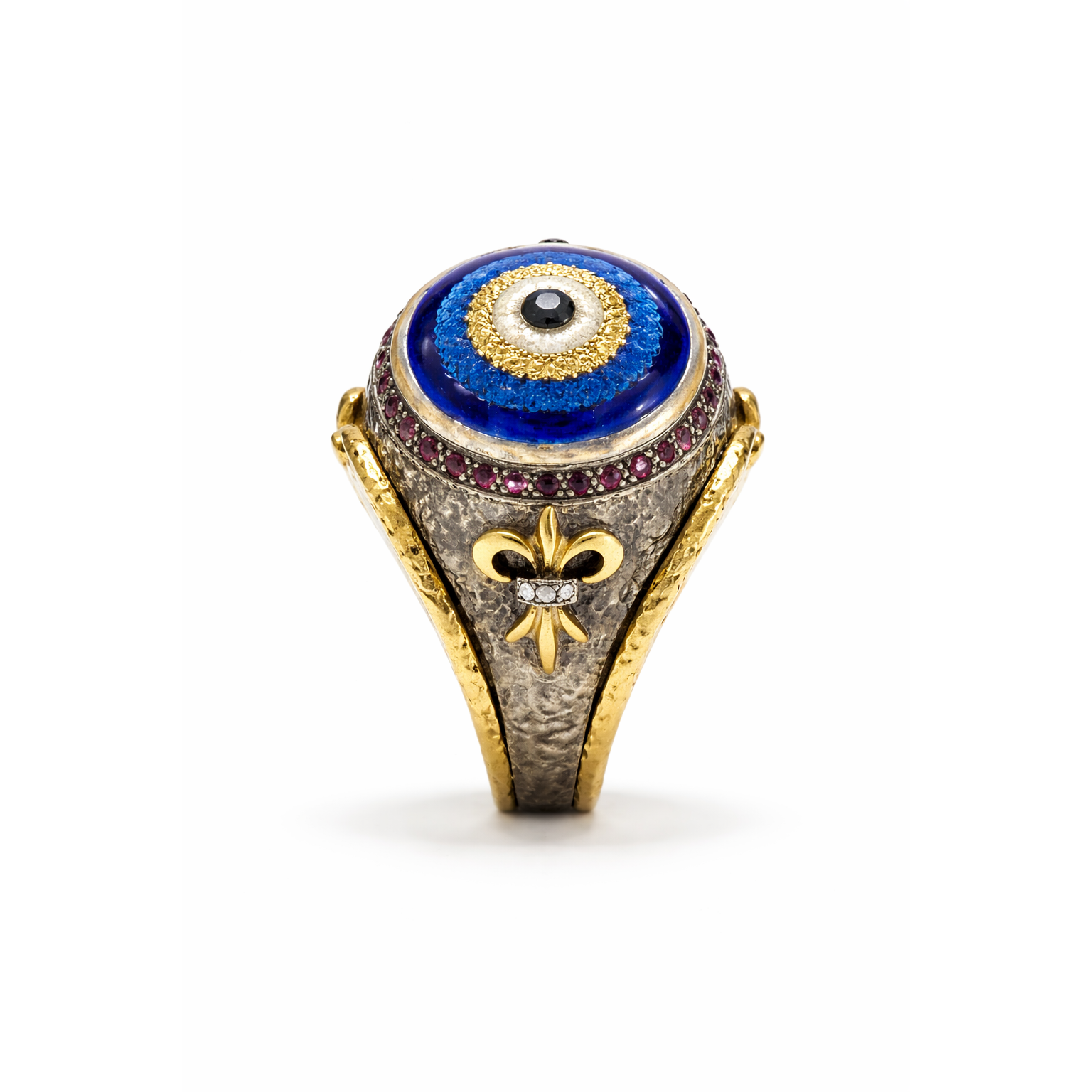 Katmanlı nazar göz formuyla tasarlanan bu yüzük, mavi tonların merkezdeki koyu taş ile oluşturduğu güçlü kontrast sayesinde dikkat çeker. Üst yüzeyde yer alan renkli taş detayları ve çevresini saran ince işçilik, tasarıma derinlik kazandırır. Yan yüzeydeki sembolik motif ve pırlanta dokunuşlar, parçaya karakterli bir görünüm ekler. Altın ve okside gümüş birlikteliği, yüzüğe dengeli ve çarpıcı bir stil kazandırır.