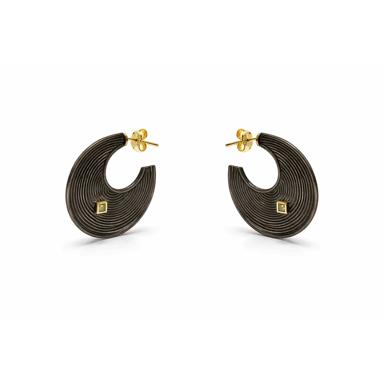Okside gümüş yüzey ve altın detayların kontrastıyla tasarlanan bu halka küpe, modern ve güçlü bir stil sunar. Dairesel form üzerindeki ince çizgili doku tasarıma derinlik kazandırırken, merkezde yer alan minimal taş detayı zarif bir ışıltı ekler. Günlük kullanıma uygun yapısıyla öne çıkan bu model, sade kombinlere karakterli bir dokunuş katmak isteyenler için ideal bir seçenektir.