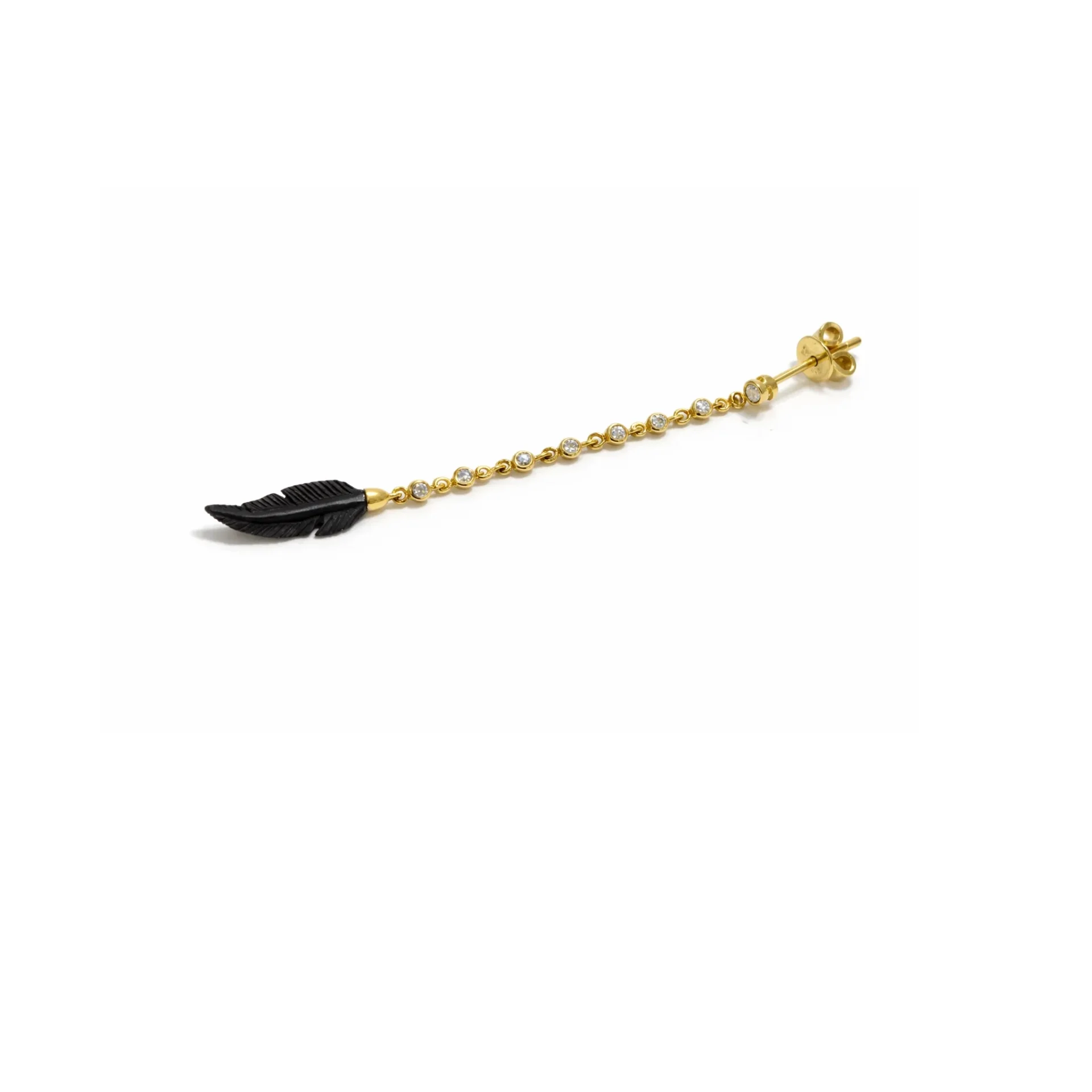 Oltu taşından tasarlanan tüy form detayı, pırlanta taşlarla süslenmiş ince zincirle birleşerek modern ve özgün bir görünüm sunar. Tek küpe olarak kullanılan bu tasarım, minimal ama dikkat çekici bir stil oluşturur. Siyah taşın derin tonu ile pırlantanın ışıltısı güçlü bir kontrast yaratır.