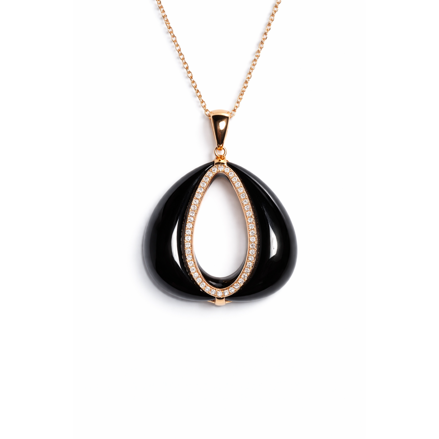 Modern çizgilerle tasarlanan bu şık kolye, derin siyah onyx taşının zarafeti ile pırlantanın ışıltısını bir araya getiriyor. Akıcı ve organik formdaki onyx yüzey, ortasında yer alan damla form pırlanta detaylı çerçeve ile dengeli ve dikkat çekici bir görünüm sunar. Altının sıcak tonları ile siyahın güçlü kontrastı, tasarıma sofistike bir karakter kazandırır. Minimal ama etkileyici duruşu sayesinde hem günlük kombinlerde hem de özel anlarda zarif bir tamamlayıcı olarak öne çıkar.