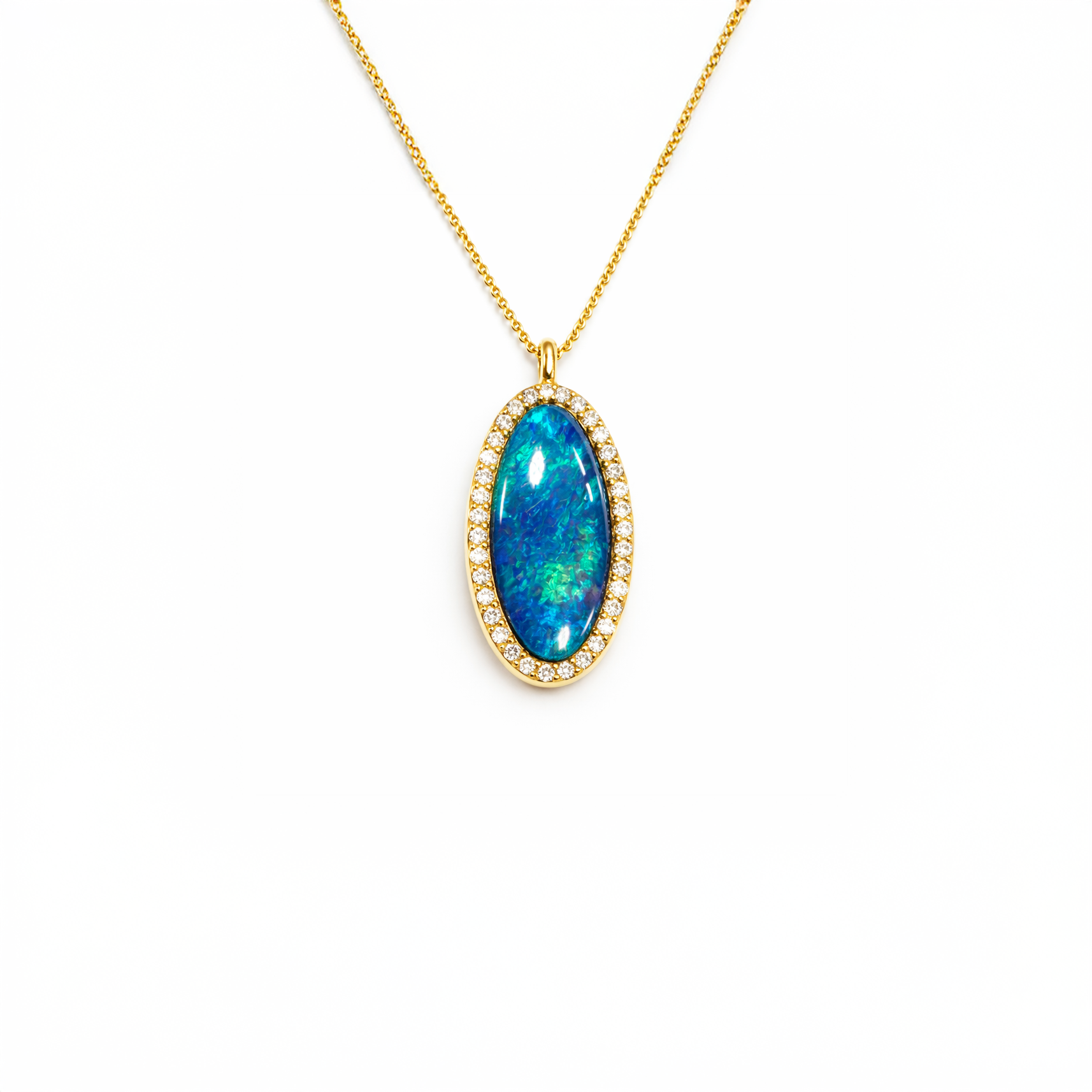 Canlı renk geçişleriyle dikkat çeken opal taşın, çevresini saran pırlanta detaylarla buluştuğu bu altın kolye, göz alıcı bir tasarım sunar. Oval formdaki opal taş, ışığa göre değişen tonlarıyla her açıdan farklı bir ışıltı yansıtırken, ince pırlanta çerçeve tasarıma zarif bir dokunuş katar. Günlük kullanımdan özel davetlere kadar geniş bir kullanım alanına sahip olan bu kolye, stilinizi tamamlayan etkileyici bir parçadır.