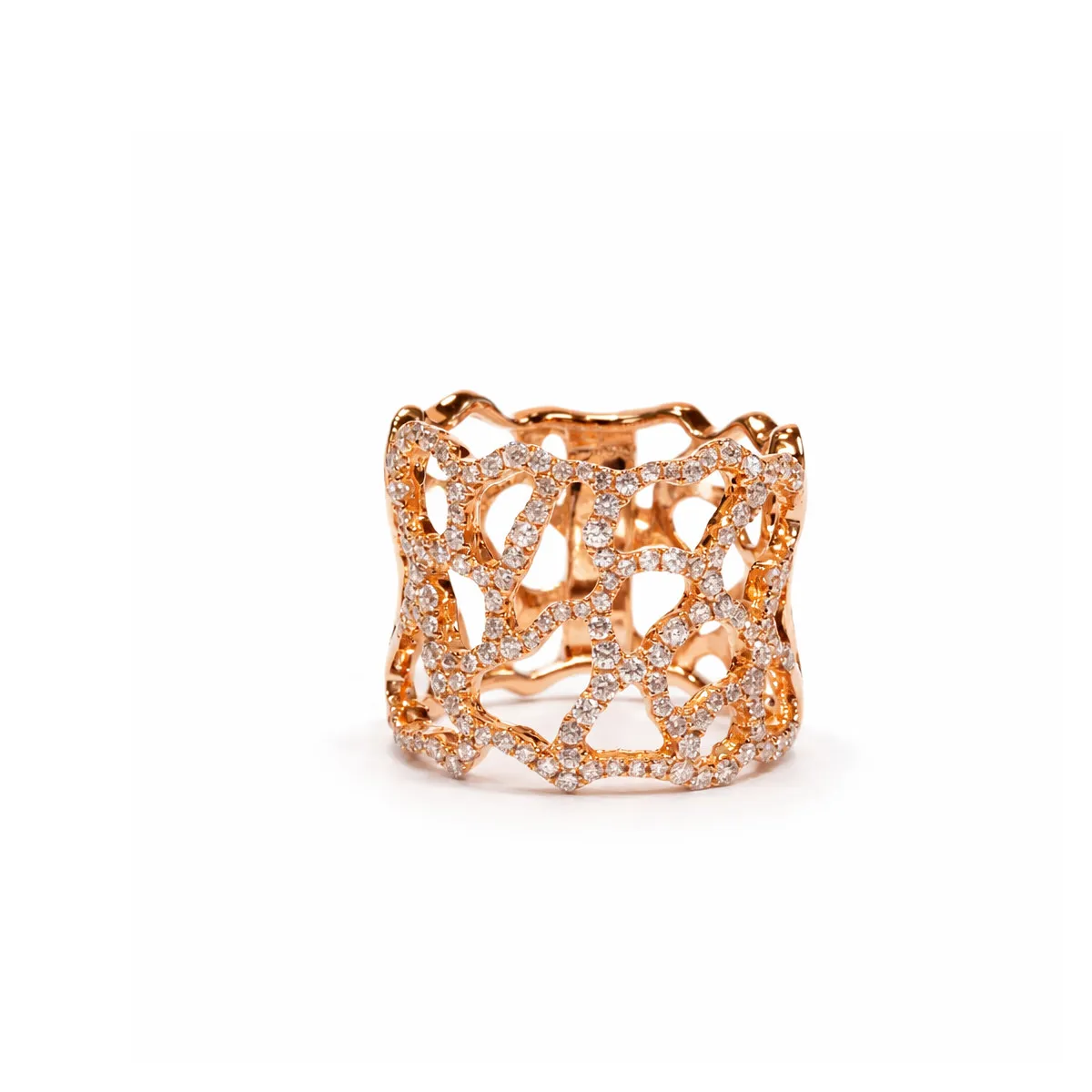 Organik ve akışkan formlardan ilham alan bu geniş altın yüzük, pırlanta taş detaylarıyla modern ve güçlü bir tasarım sunar. Zarif boşluklu yapısı sayesinde hem gösterişli hem de şık bir görünüm sağlar.