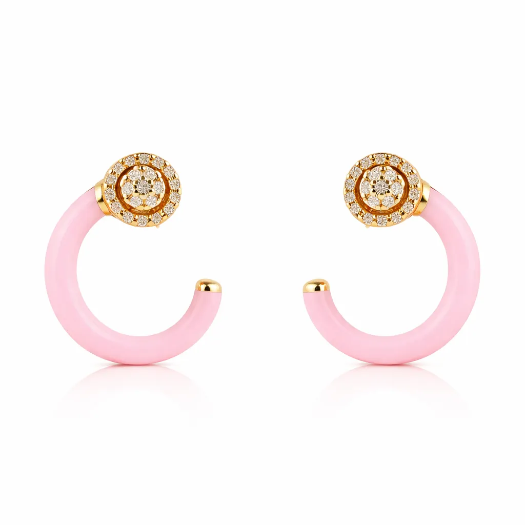 Yumuşak pembe mine yüzeyi ve ışıltılı taş detaylarıyla tasarlanan bu halka küpe, feminen ve zarif bir stil sunar. Uç kısmındaki dairesel taş süslemeler, tasarıma parlak bir dokunuş katarken, pastel ton küpeye sıcak ve dikkat çekici bir görünüm kazandırır.
