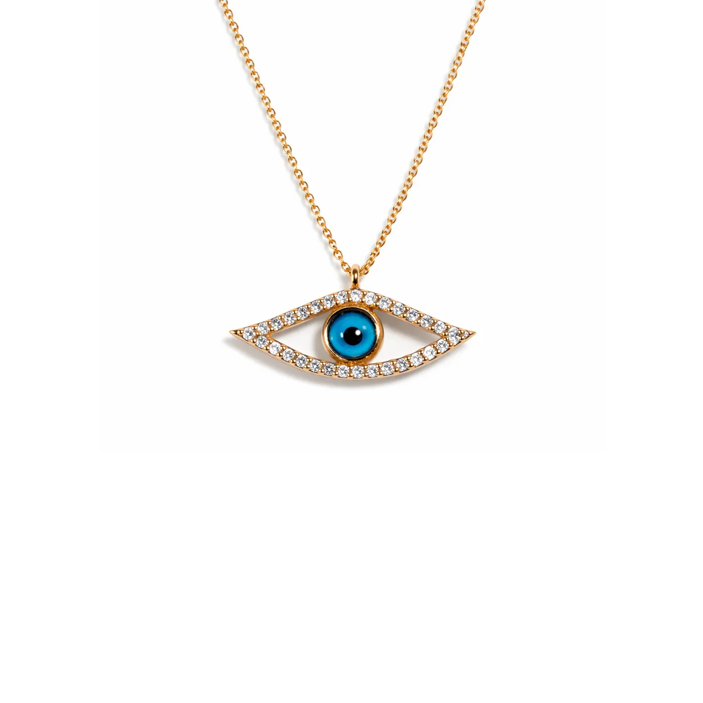 Merkezinde nazar göz detayı bulunan ve çevresi pırlanta taşlarla süslenen bu altın kolye, zarif ve modern bir tasarım sunar. Minimal çizgileri ve güçlü sembol anlamıyla günlük kullanım ve özel kombinler için ideal bir mücevherdir.