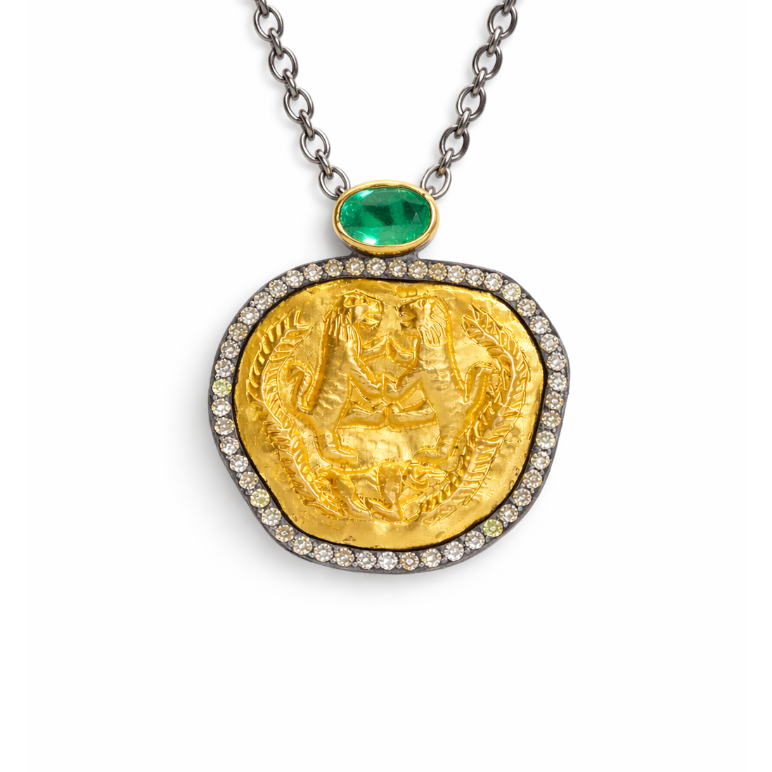 Pırlanta Detaylı Zümrüt Taşlı Antik Figürlü Altın ve Gümüş Kolye