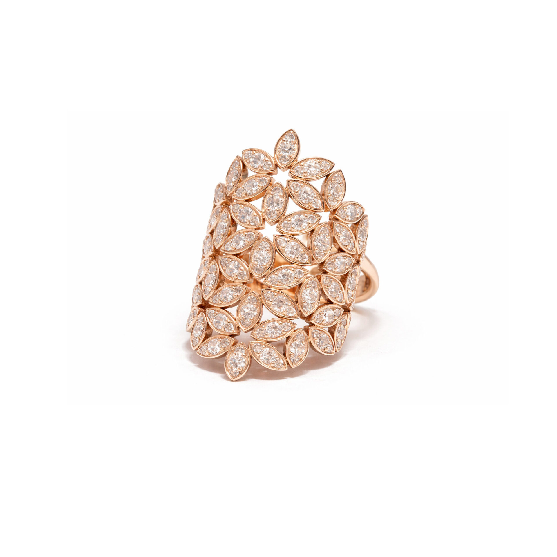 Çiçek formundan ilham alan bu yüzük, rose altın ton ve yoğun pırlanta dizilimiyle dikkat çeker. Işıltılı yapısına rağmen dengeli bir görünüm sunar. Günlük kullanımdan özel kombinlere kadar rahatlıkla tercih edilebilir.