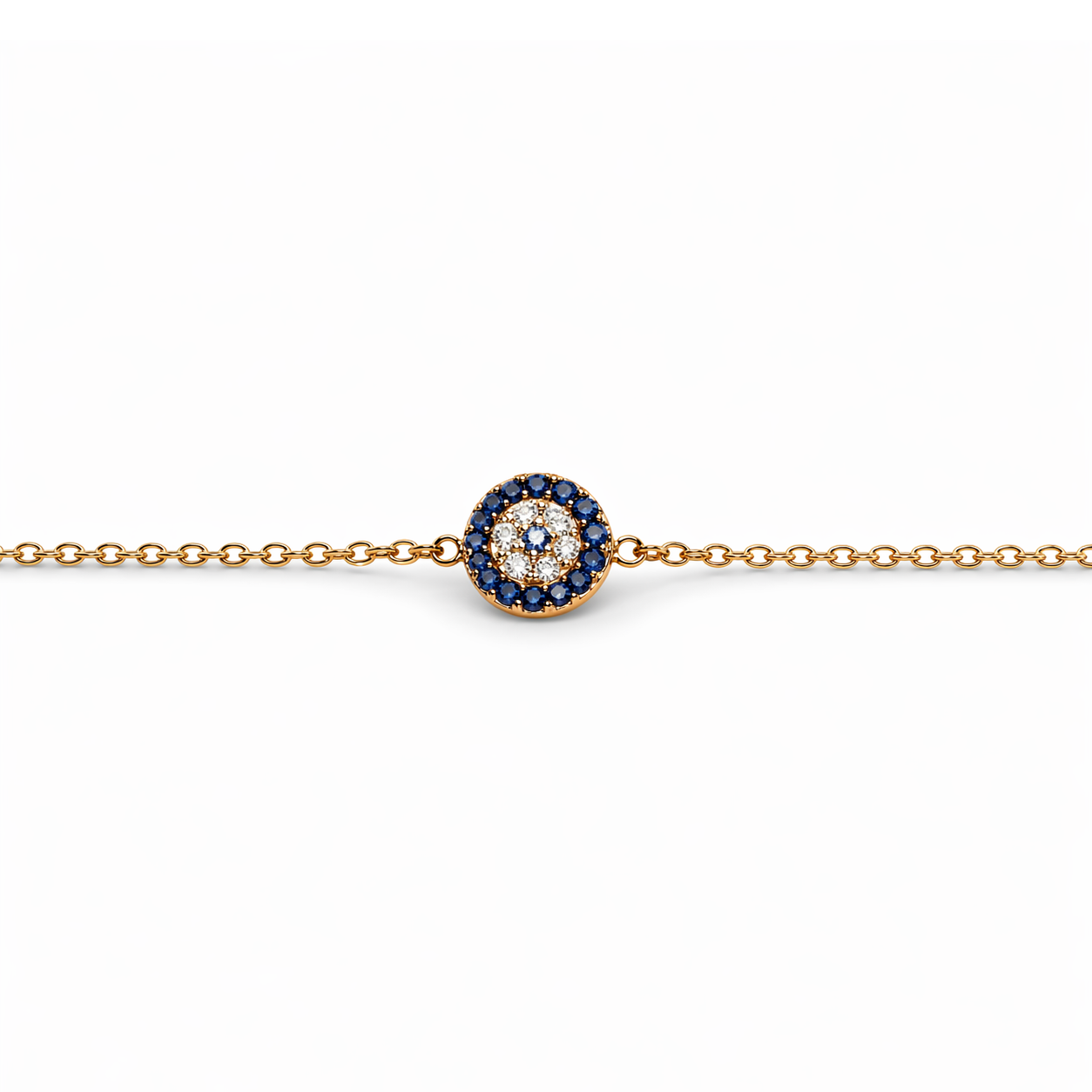 Sarı altının sıcak tonlarıyla tasarlanan bu bileklik, safir ve pırlanta taşların uyumuyla dikkat çeken zarif bir nazar motifi sunar. Derin mavi safir taşlar, merkezdeki pırlanta detaylarla birleşerek göz alıcı bir kontrast oluşturur.