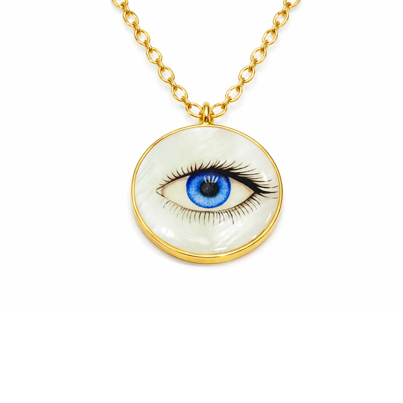 Doğal sedef yüzey üzerine işlenen zarif göz motifi, bu kolyeye sade ama etkileyici bir karakter kazandırır. Mavi göz detayı ile kontrast oluşturan parlak sedef zemin, ışıkla birlikte farklı yansımalar sunarak tasarımı canlı hale getirir. Minimal altın çerçeve ve zincir ile tamamlanan bu parça, hem modern hem anlam yüklü bir stil sunar. Günlük kullanımda zarif bir dokunuş, özel anlarda ise dikkat çekici bir tamamlayıcıdır.